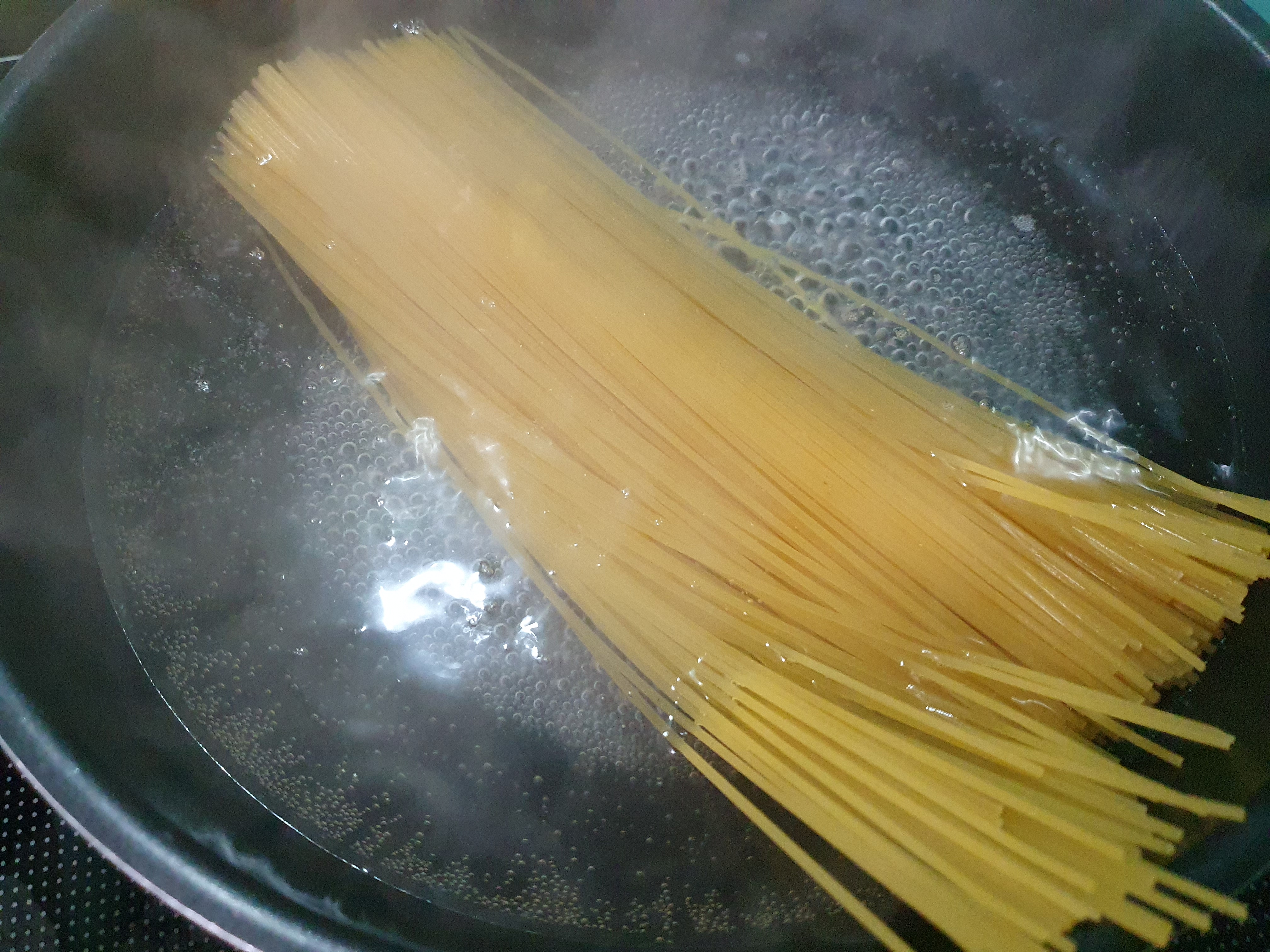 먼저 스파게티면을 삶았습니다. 끓는 물에 소금을 조금 넣고서 10분간 삶았습니다. 딱딱한 식감을 좋아하시면 8분간만 삶으시면됩니다.