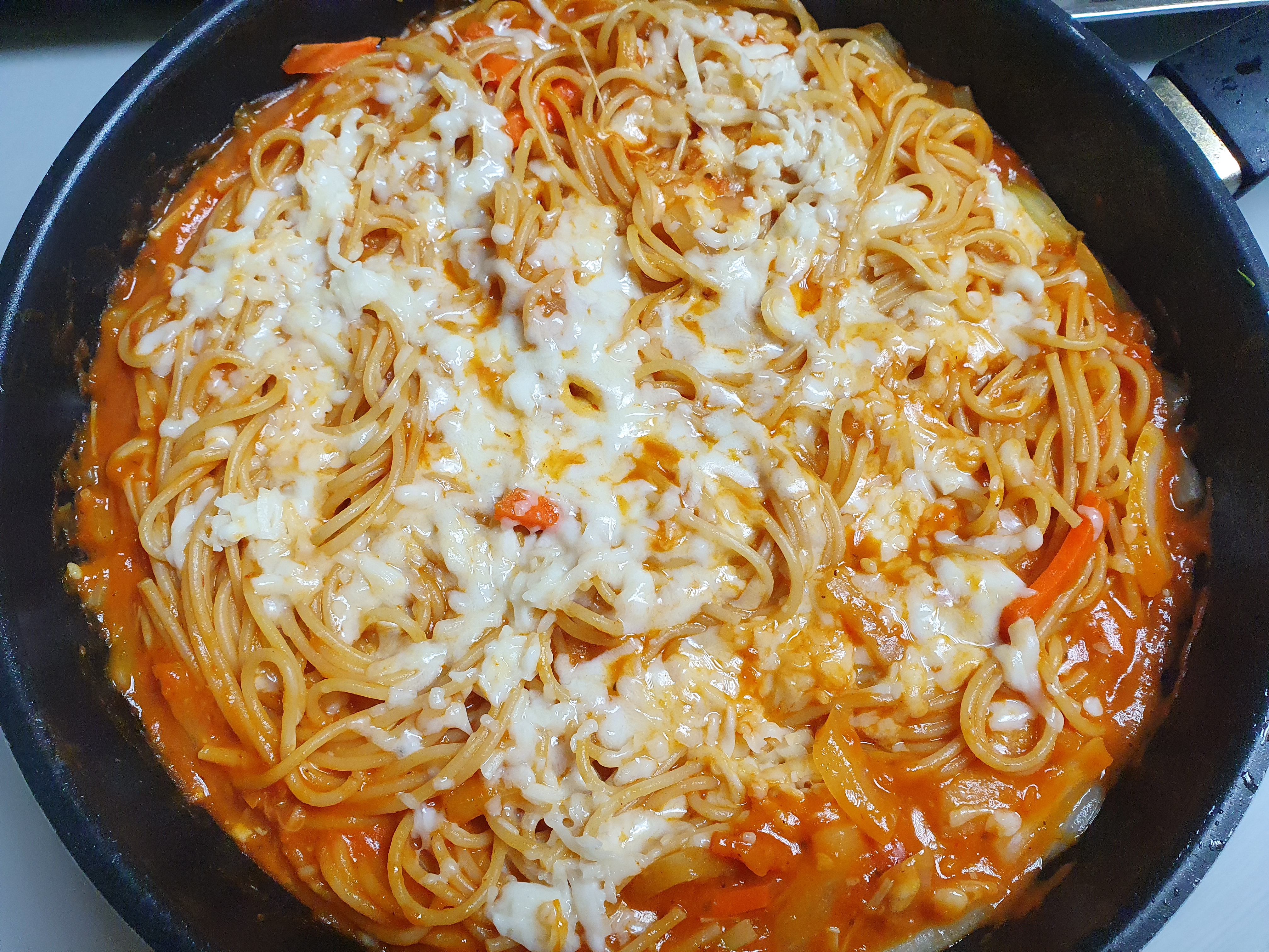 마지막으로 삶은 면을 넣고, 백설 로제스파게티 소스를 한통 다 부어주었습니다. 그리고 위에 치즈를 뿌려주었습니다. 소스 덕분에 집에서 간편하게 스파게티 요리를 해먹을 수 있었습니다. 매운맛이 전혀 없어서 아이들도 맛있게 잘 먹었습니다.