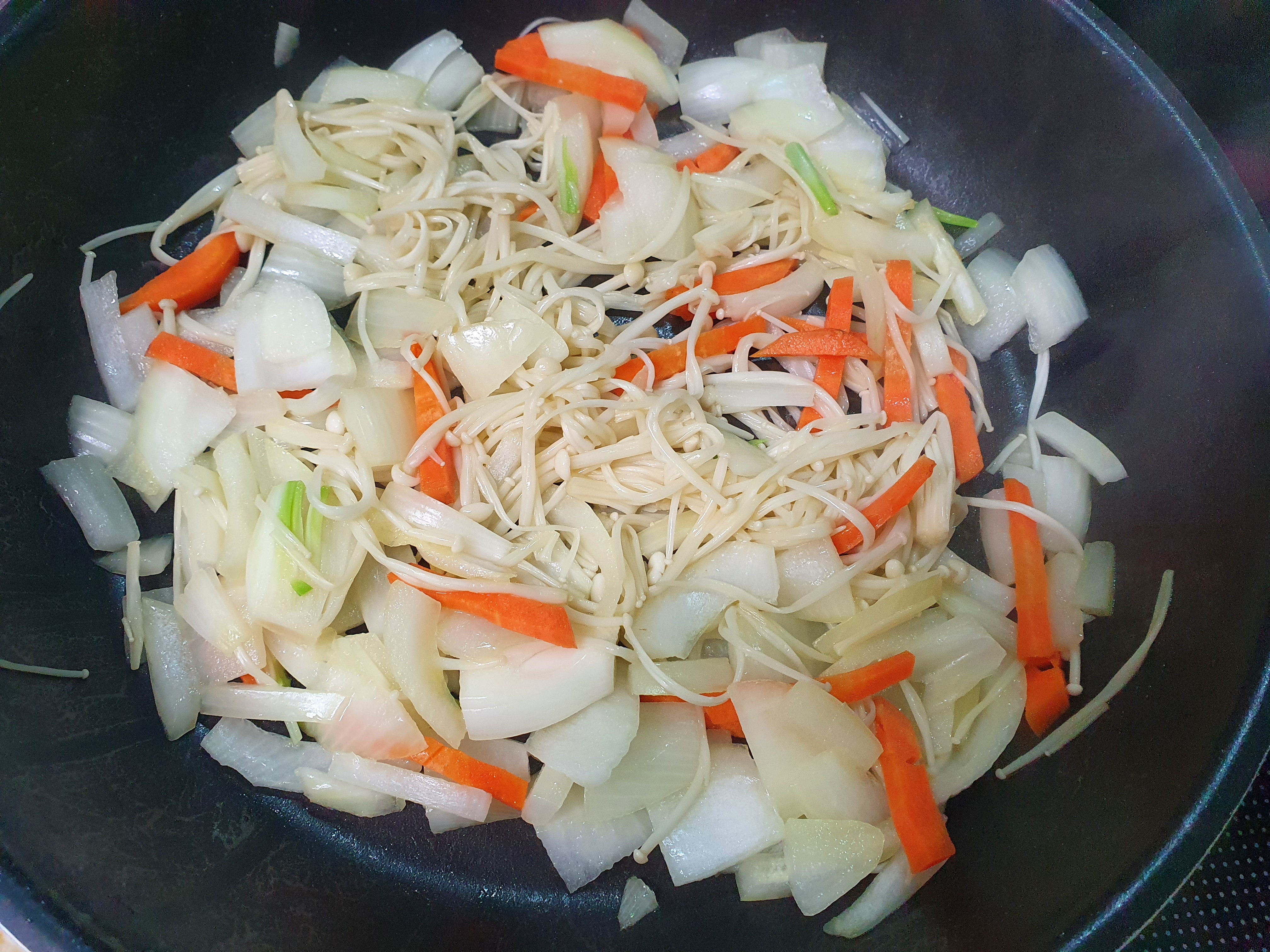 그 사이 집에 있는 각종 야채들을 볶았습니다. 양파, 당근, 팽이버섯을 넣었습니다.