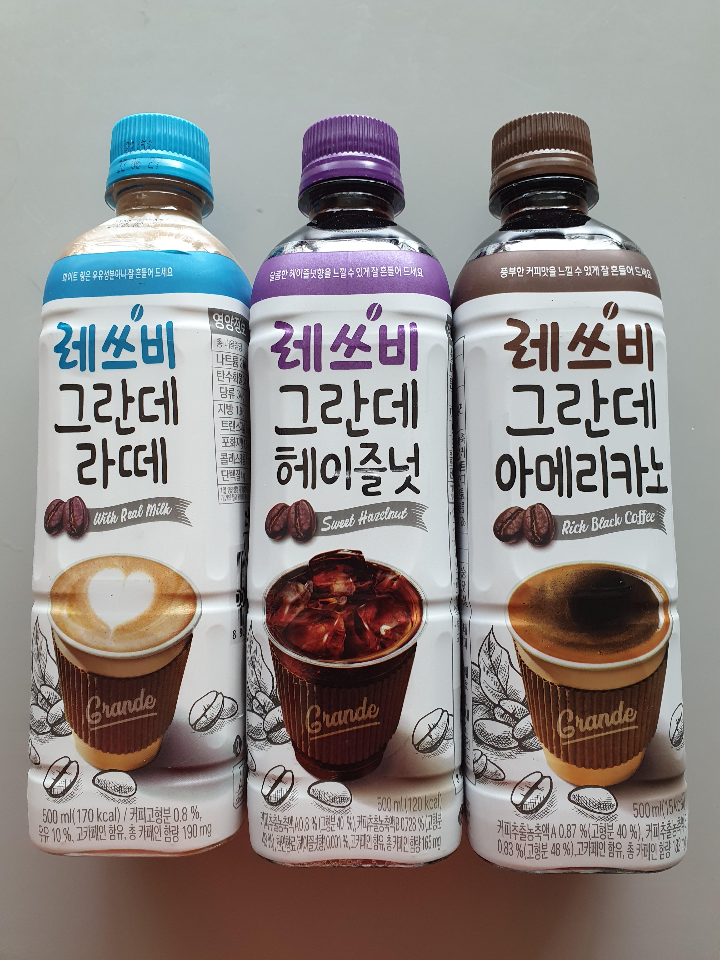 종류도 3가지가 있습니다. 레쓰비 그란데 라떼, 헤이즐럿, 아메리카노입니다.
