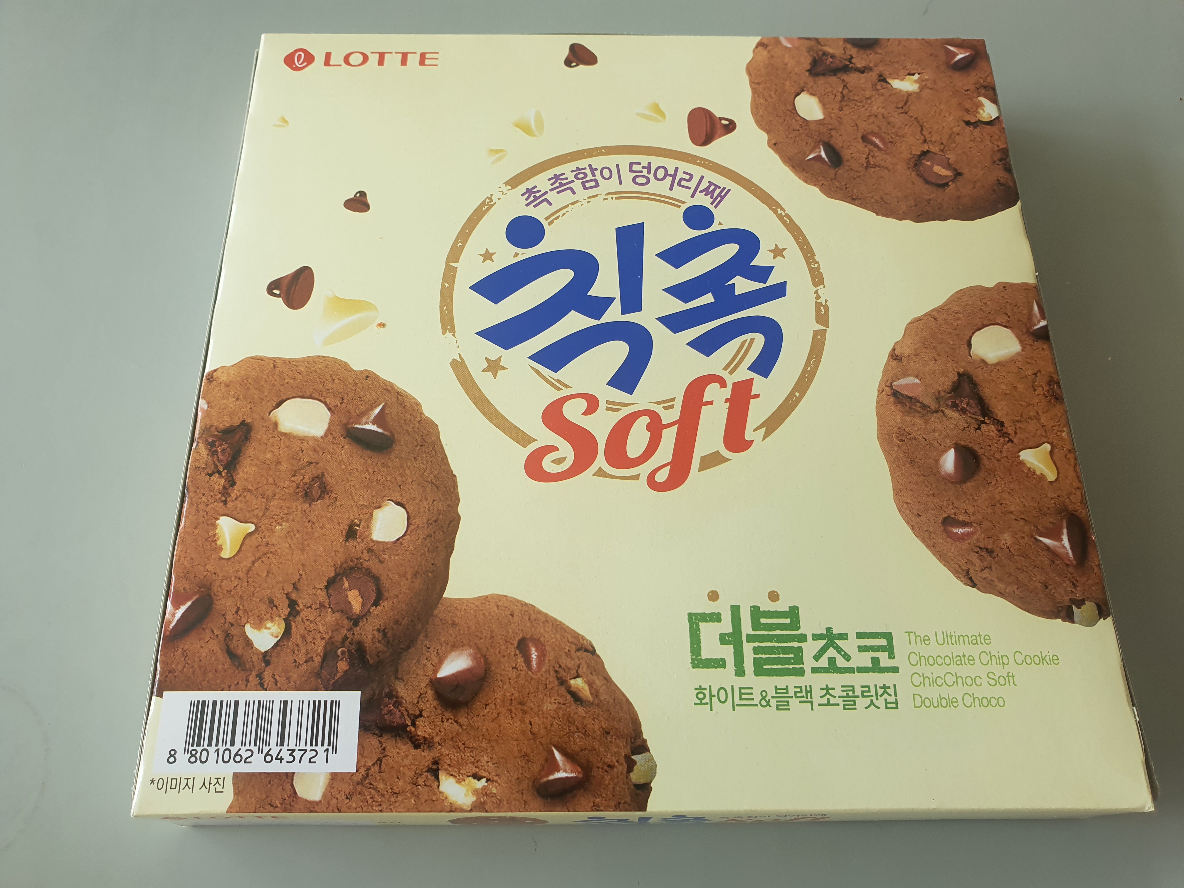 오늘은 새로운 칙촉 두종류를 소개해보고자 합니다. 먼저 "칙촉 soft 더블초코"입니다. 화이트 초콜릿과 블랙 초콜릿이 동시에 들어가있는 칙촉입니다. 이름처럼 더 부드럽기도하죠.