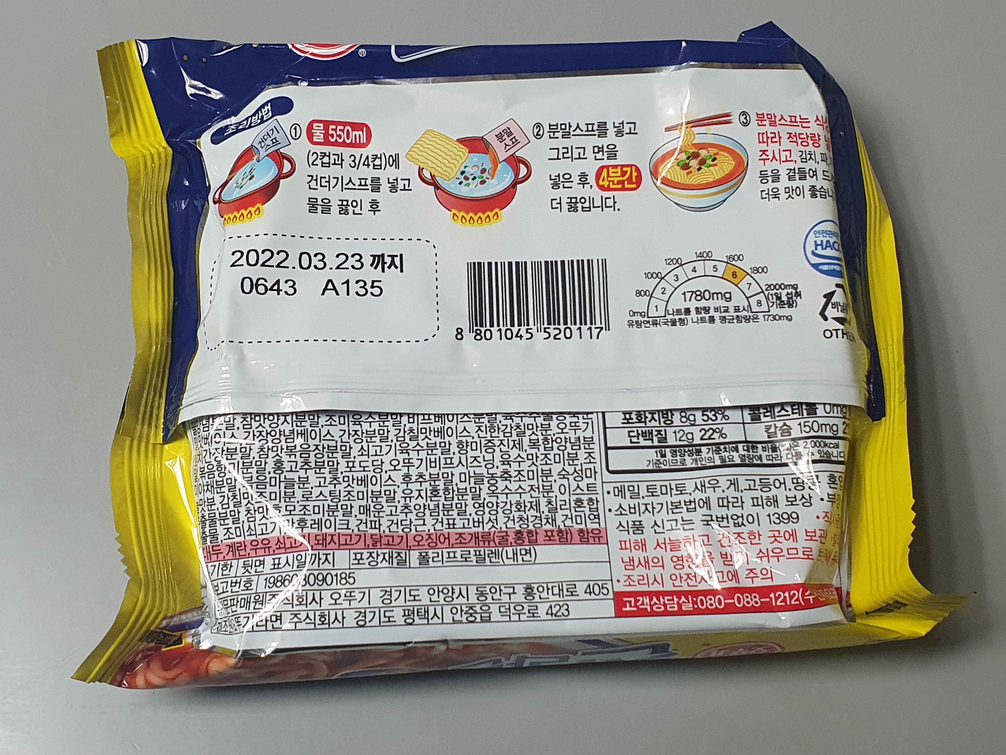 뒷면입니다. 조리방법이 자세하게 나와있습니다. 물550ml에 건더기스프를 넣고 물을 끓인후, 분말스프를 넣고 면을 넣은 후, 4분간 더 끓입니다. 김치, 파, 계란등을 곁들여 드시면 더욱 맛이 좋습니다.