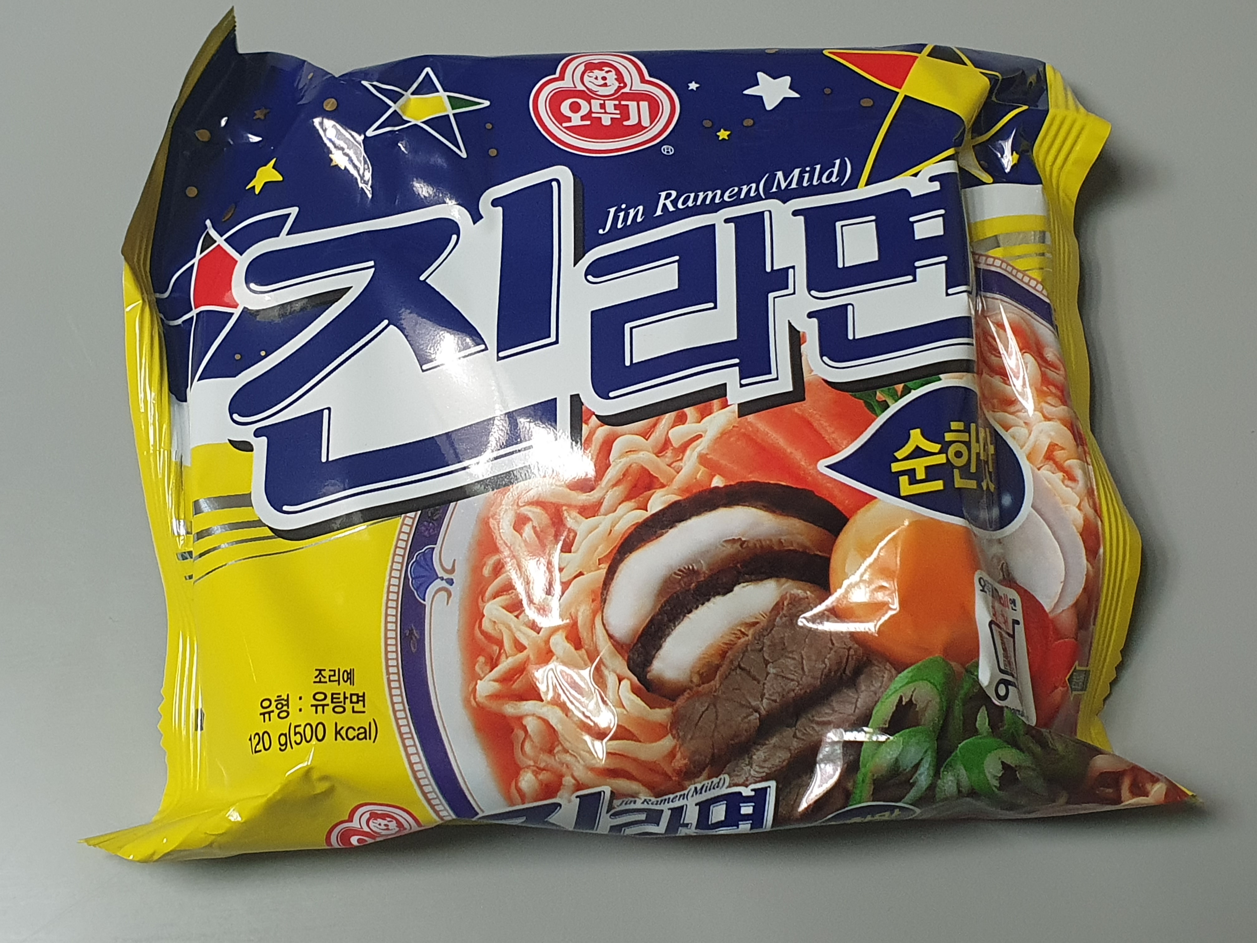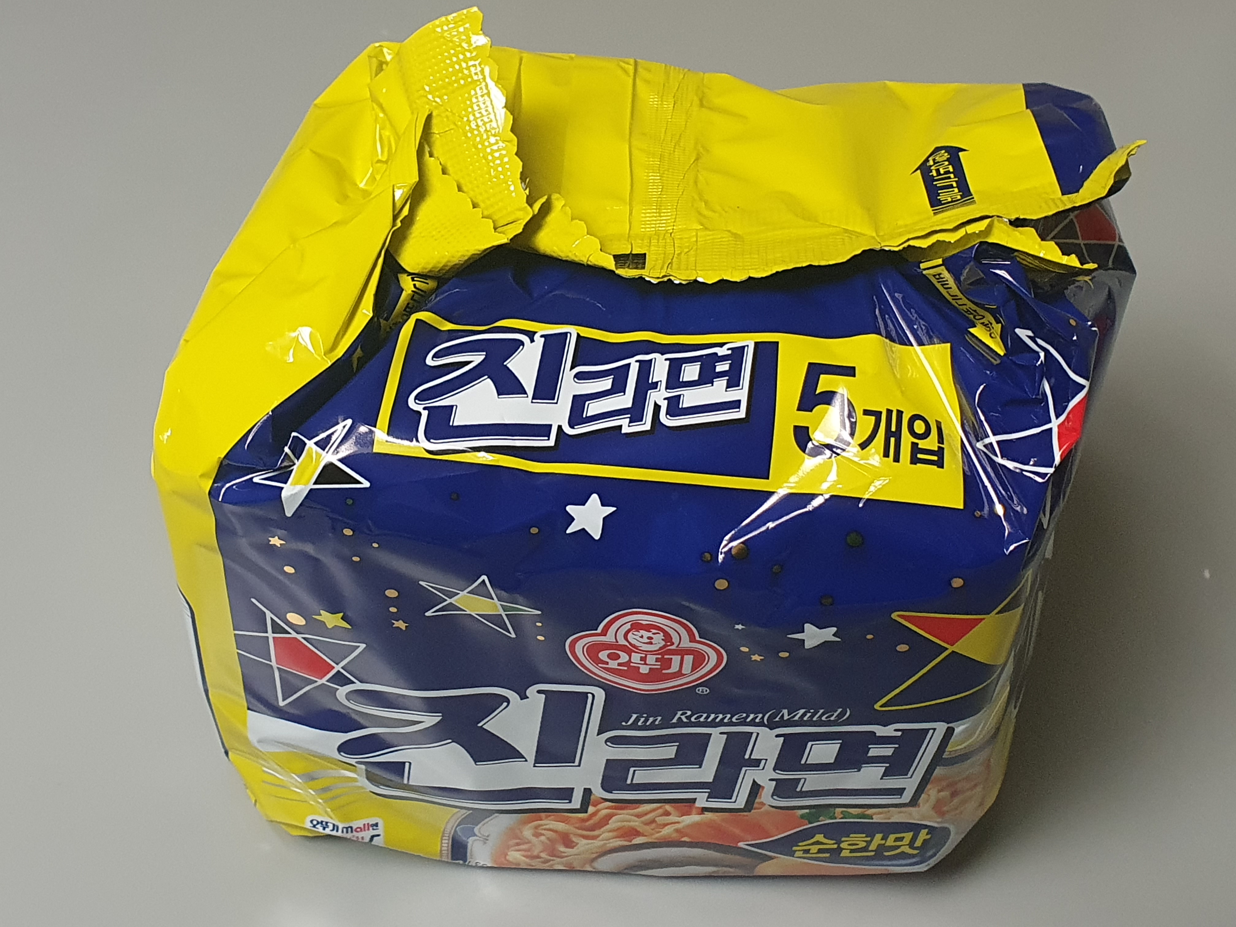 진라면 순한맛입니다. 마트에 가면 이렇게 5개 묶음으로 된 라면을 주로 사게 됩니다.