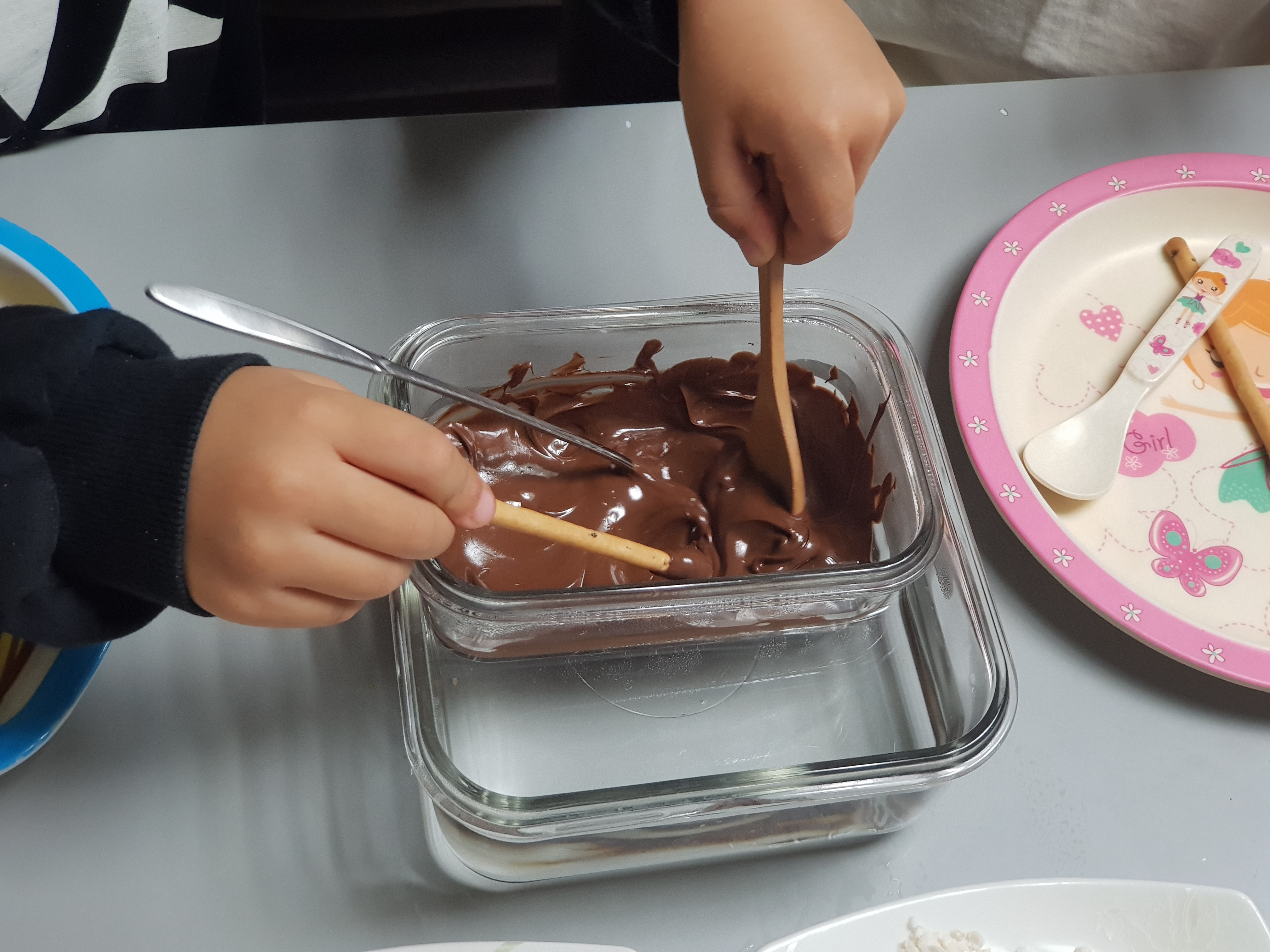 스틱과자에 녹은 초콜릿을 묻힙니다. 초콜릿이 충분하면 한번 담그면 되겠지만, 적을때는 숟가락을 이용해서 골고루 묻혀주면 됩니다.
