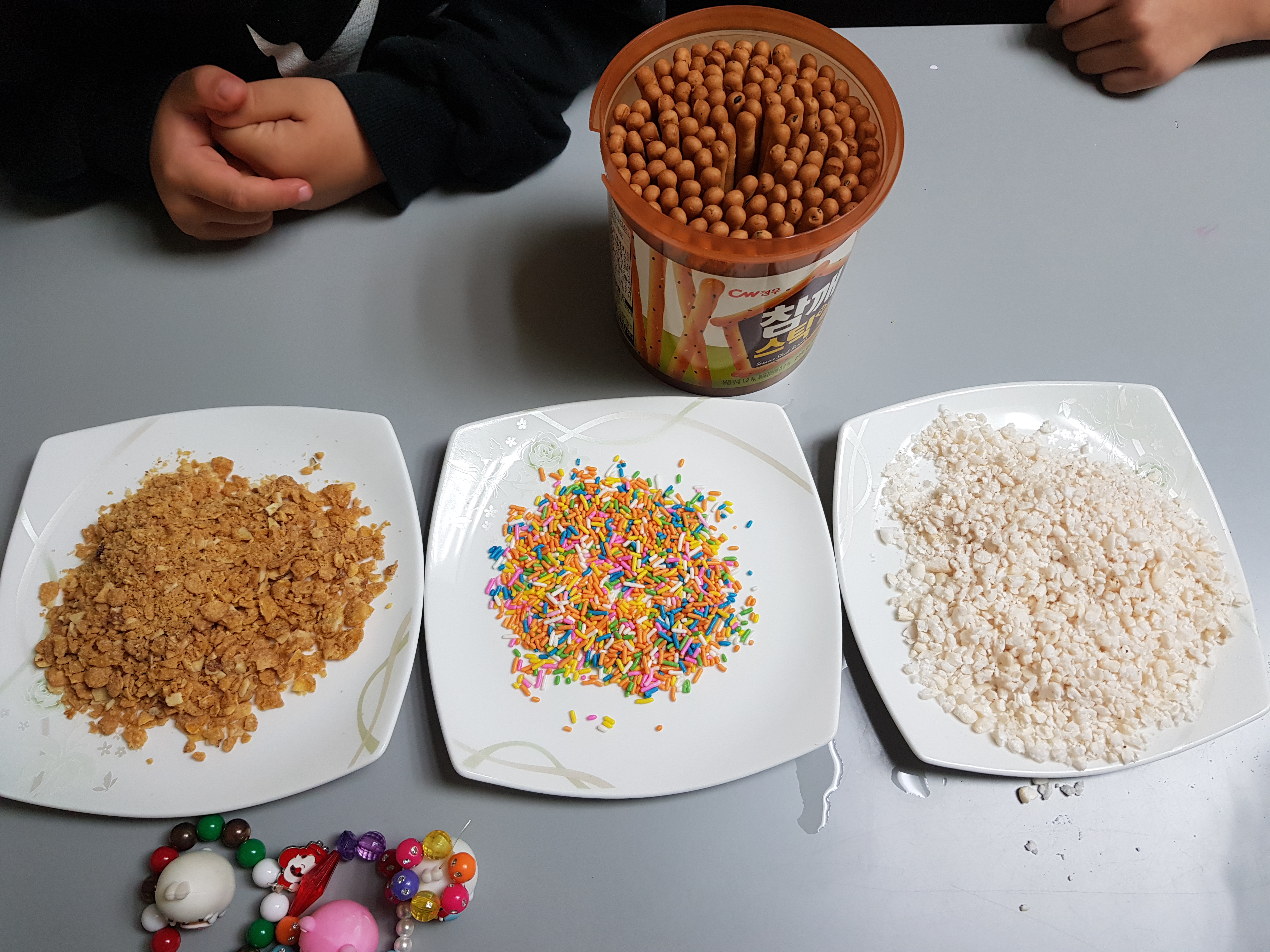 각자 원하는 토핑들을 뿌려서 빼빼로 만들기를 해보았습니다. 아이들이 정말 재미있어합니다. 빼빼로를 만들다가 과자가 부러지거나 실패를 하게 되면 먹으라고 했더니 계속 실패했다면서 먹네요