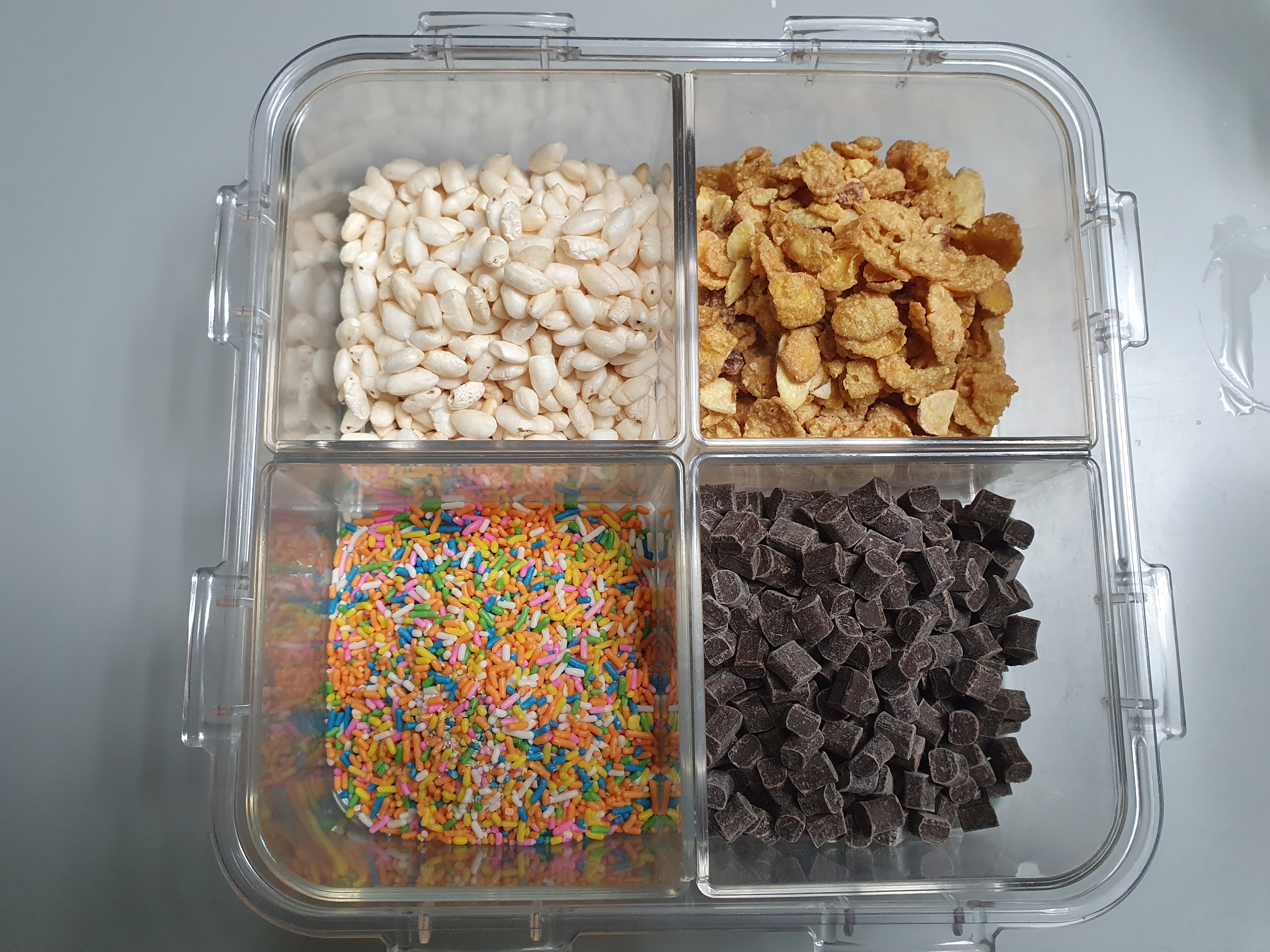 토핑 - 뻥튀기 토핑, 시리얼 토핑, 무지개 토핑을 준비했습니다.