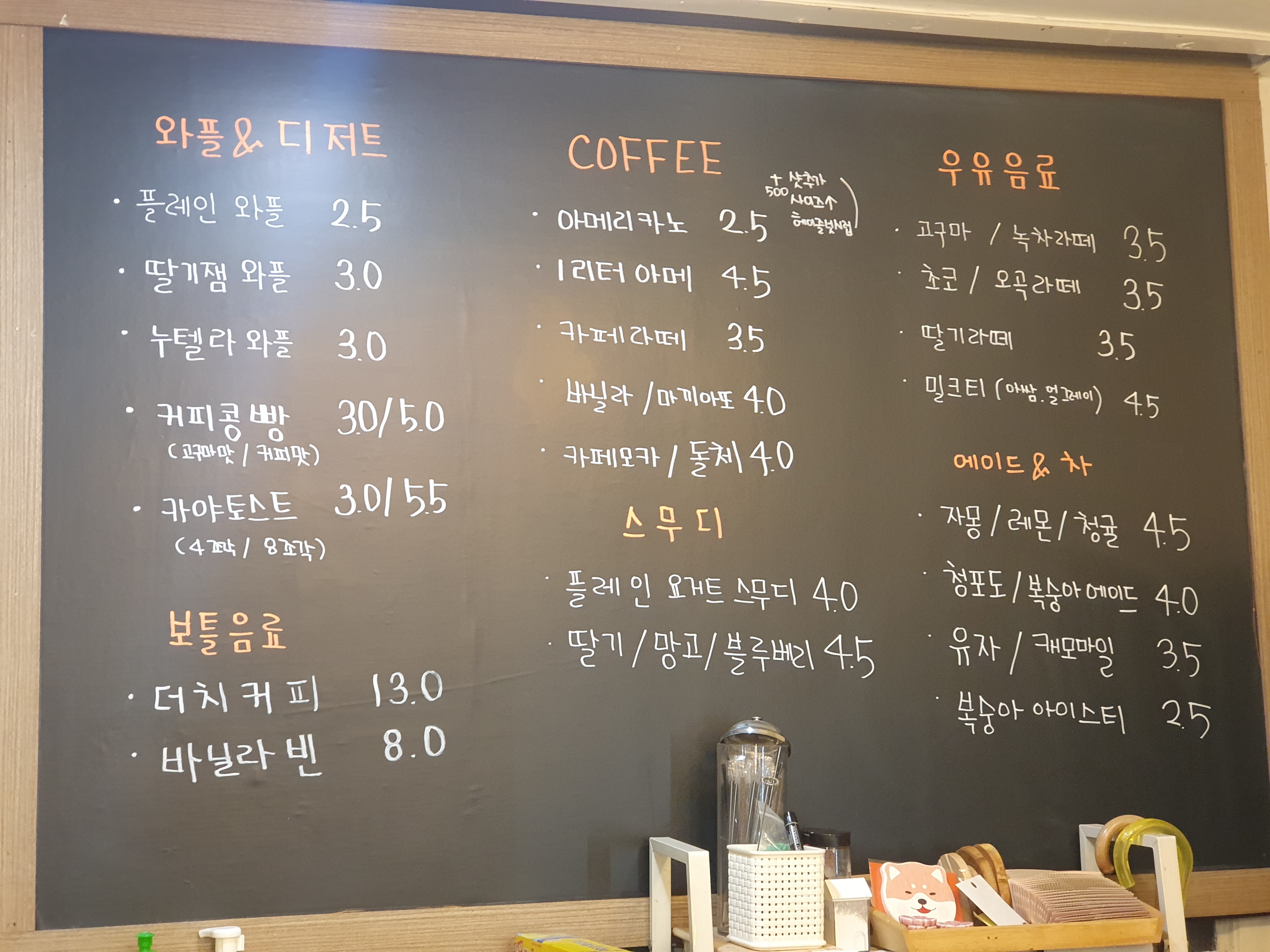 메뉴입니다. 와플&디저트, 보커피, 스무디, 우유음료, 에이드&차, 보틀음료까지!! 다 먹어보고 싶네요!!