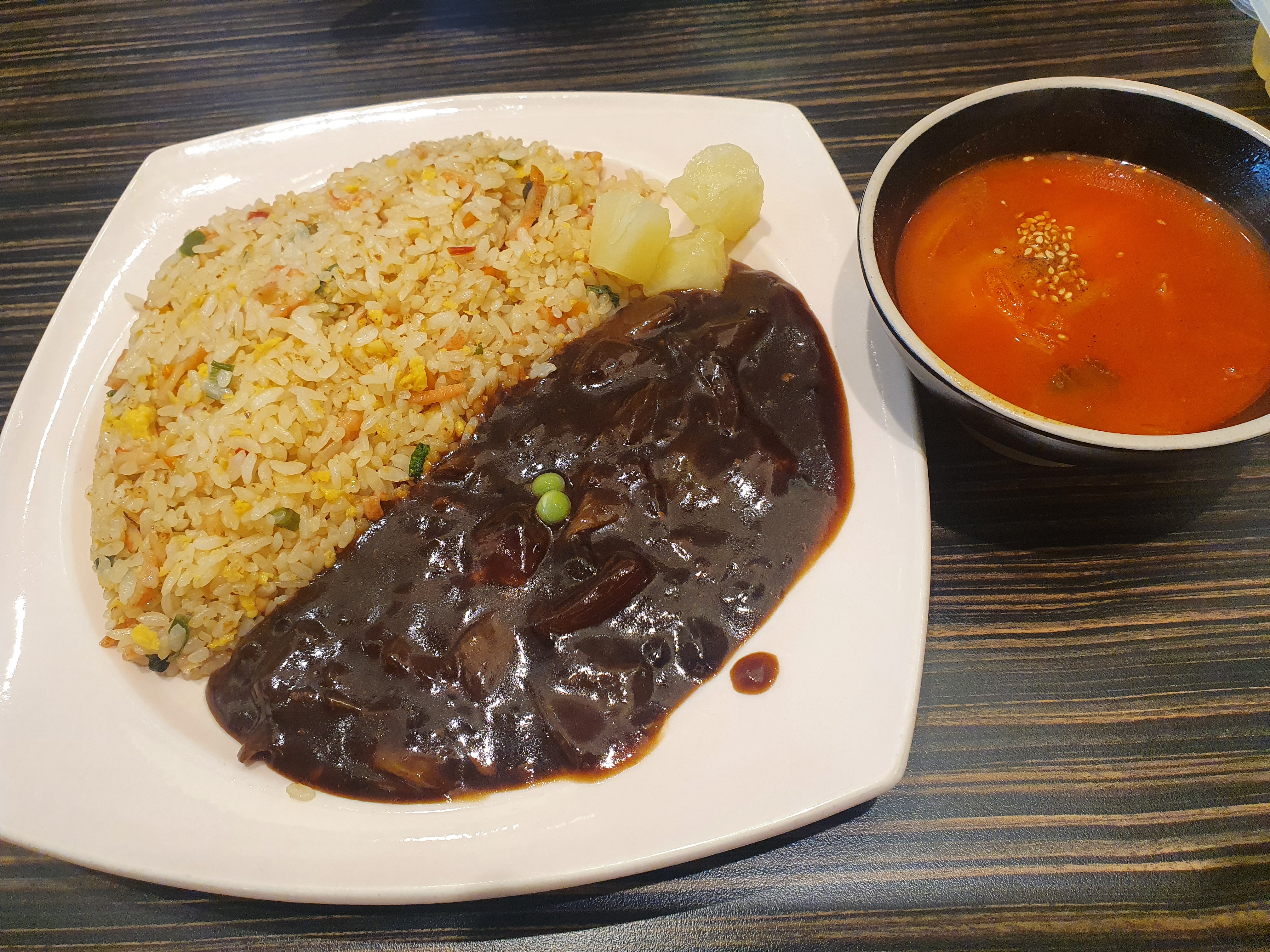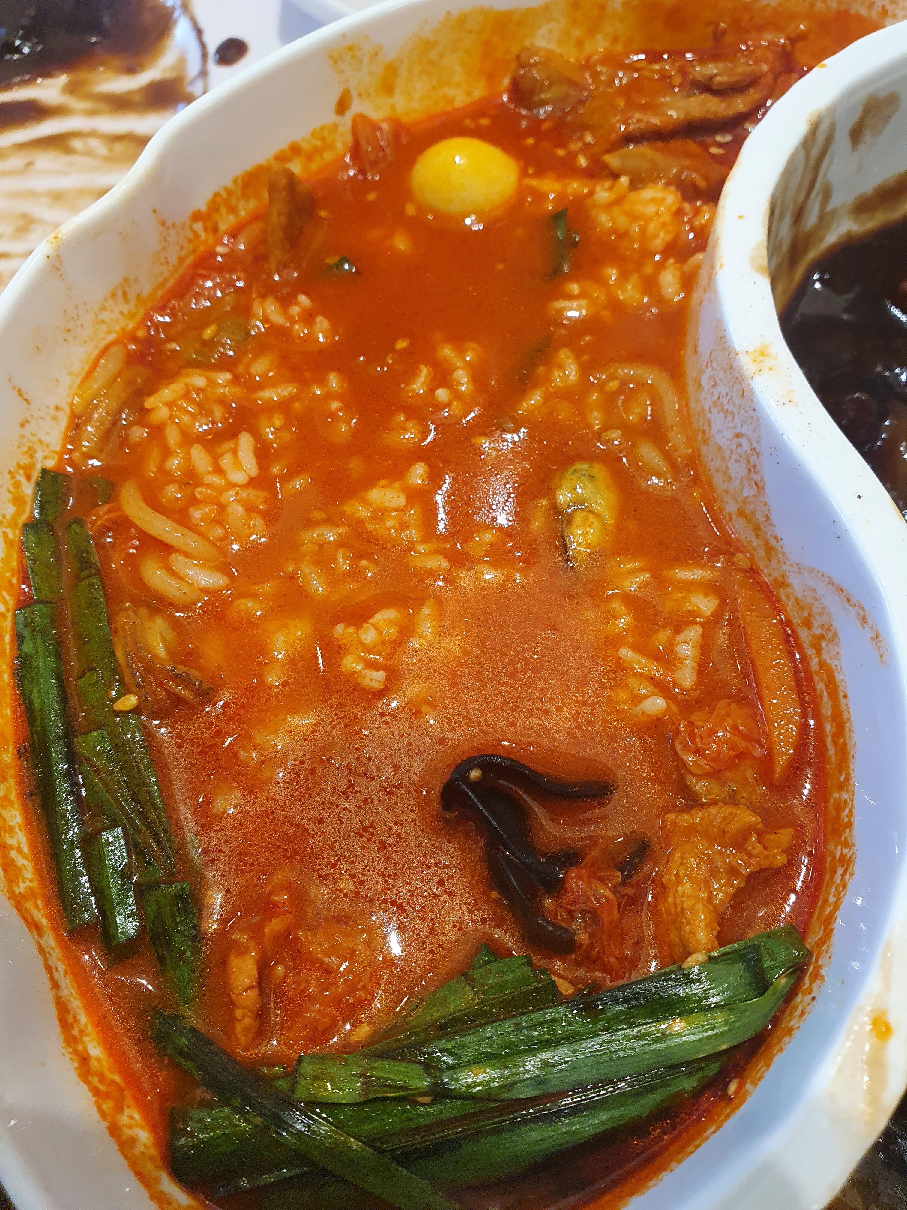 짬짜면을 시키면 공기바이 같이 나옵니다. 짬뽕에 있는 면을 다 먹은 뒤에 밥을 말아서 짬뽕밥을 만들어보았습니다.