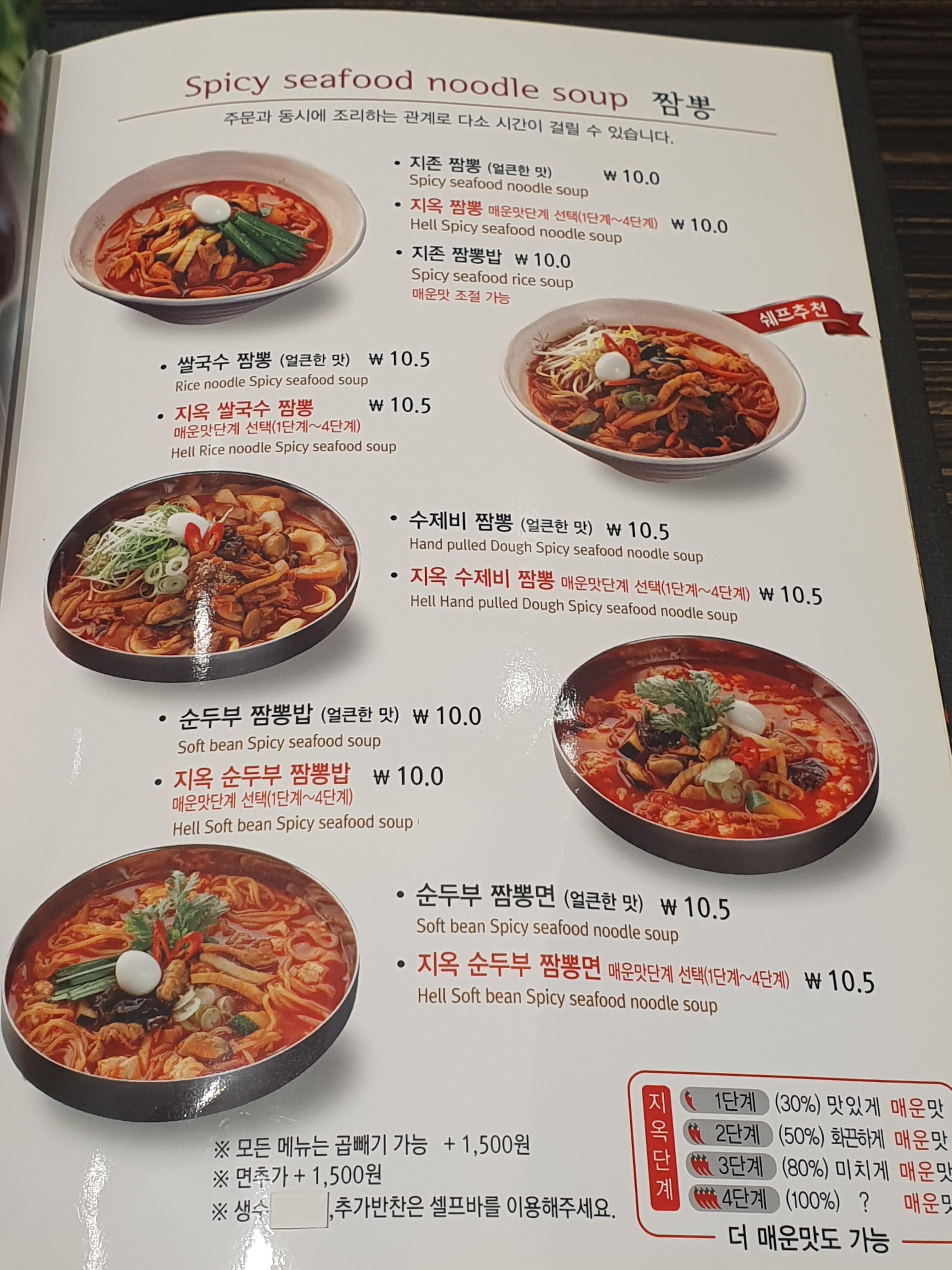 짬뽕메뉴입니다. 지존 짬뽕, 지옥 짬뽕, 지존 짬뽕밥, 쌀국수 짬뽕, 지옥 쌀국수 짬뽕, 수제비 짬뽕, 지옥 수제비 짬뽕, 순두부 짬뽕밥, 지옥 순두부 짬뽕밥, 순두부 짬뽕면, 지옥 순두부 짬뽕면이 있습니다.