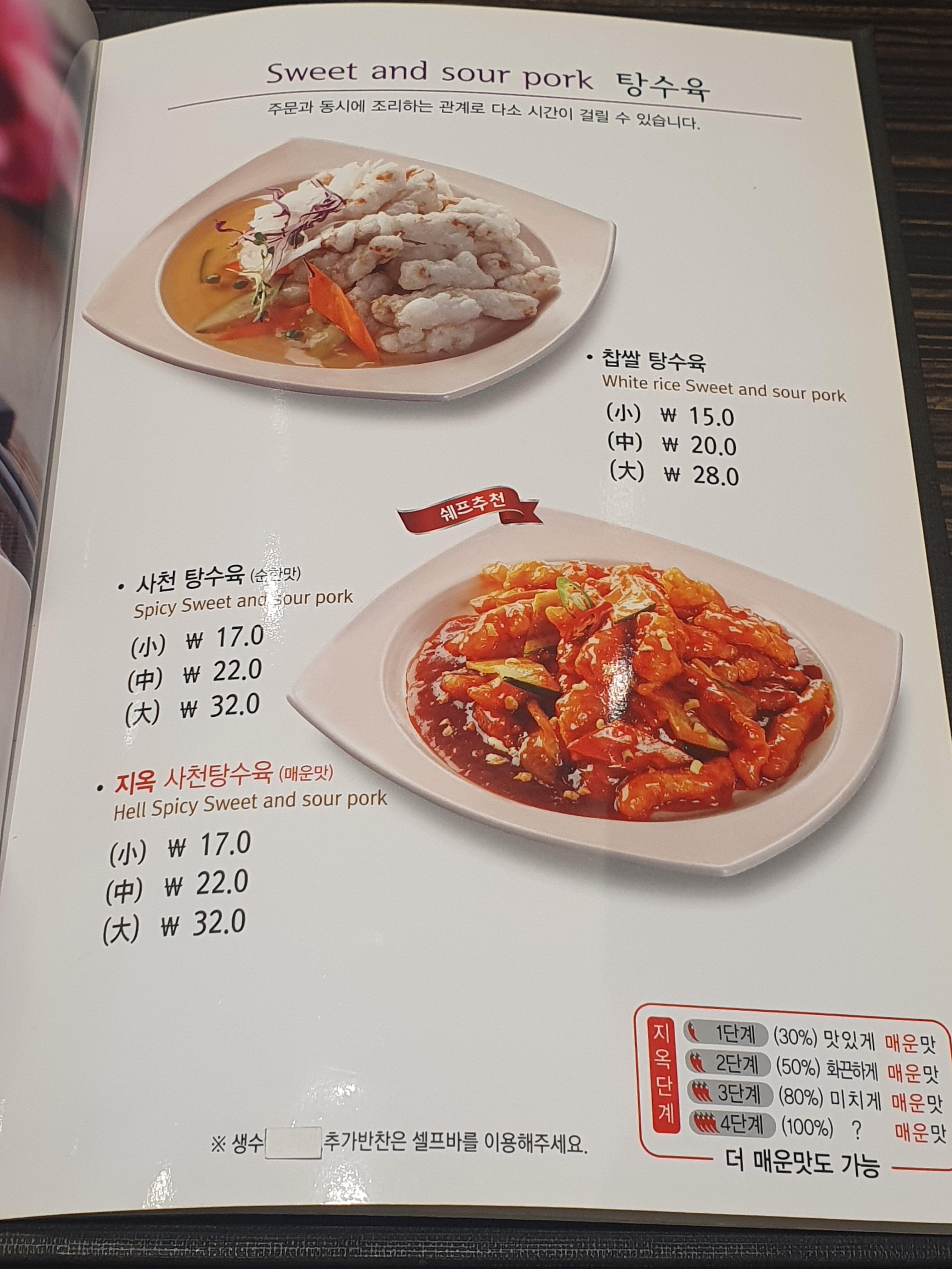찹쌀 탕수육, 사천 탕수육, 지옥 사천 탕수육이 있습니다. 지옥 사천 탕수육이 조금 궁금하긴 하지만 아이들과 함께 먹어야하기 때문에 찹쌀 탕수육을 시켰습니다.