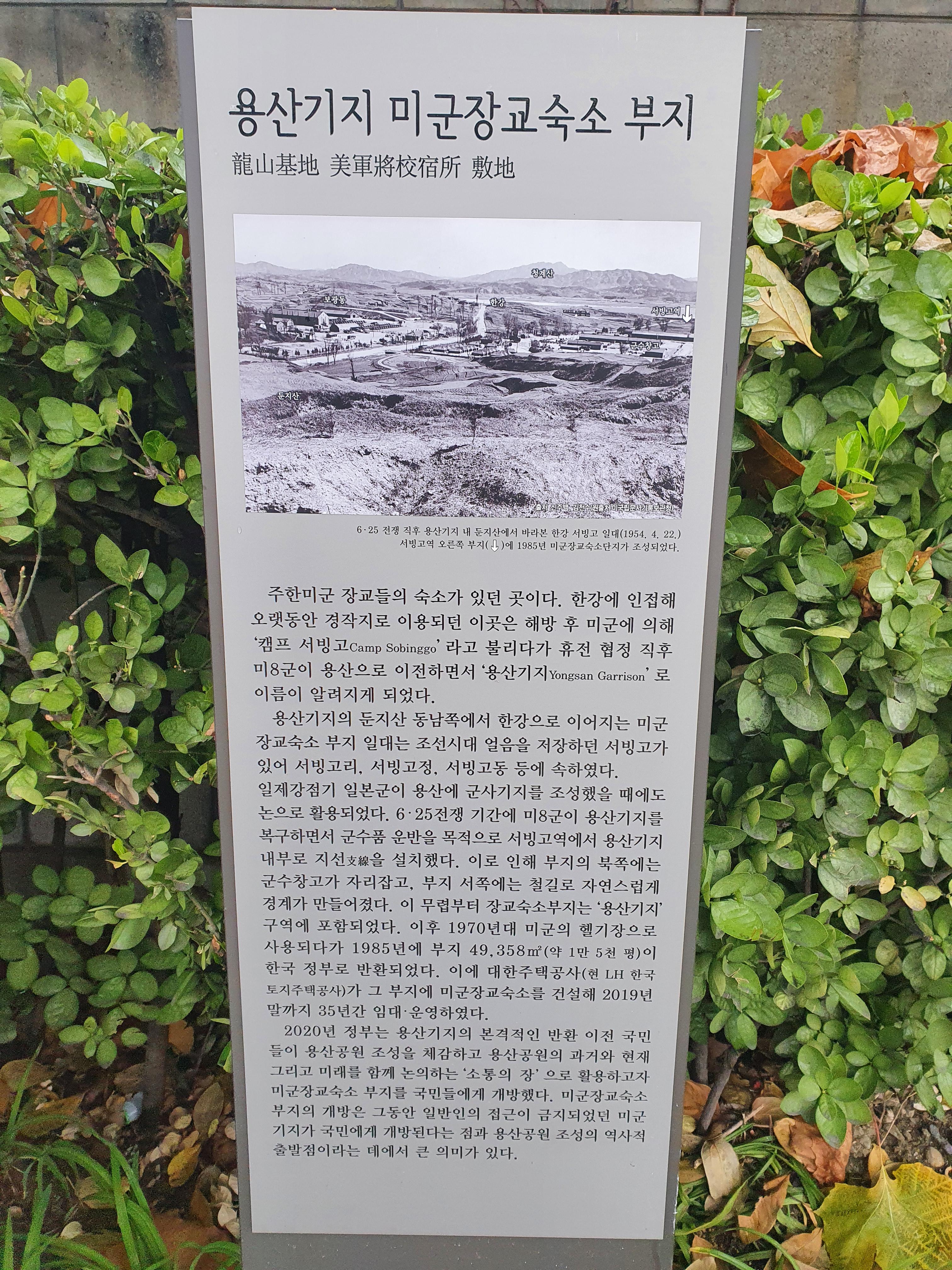출입구 옆에 이렇게 용산기지 미군장교숙소 부지에 대한 사진과 역사에 대한 설명을 볼 수 있습니다.