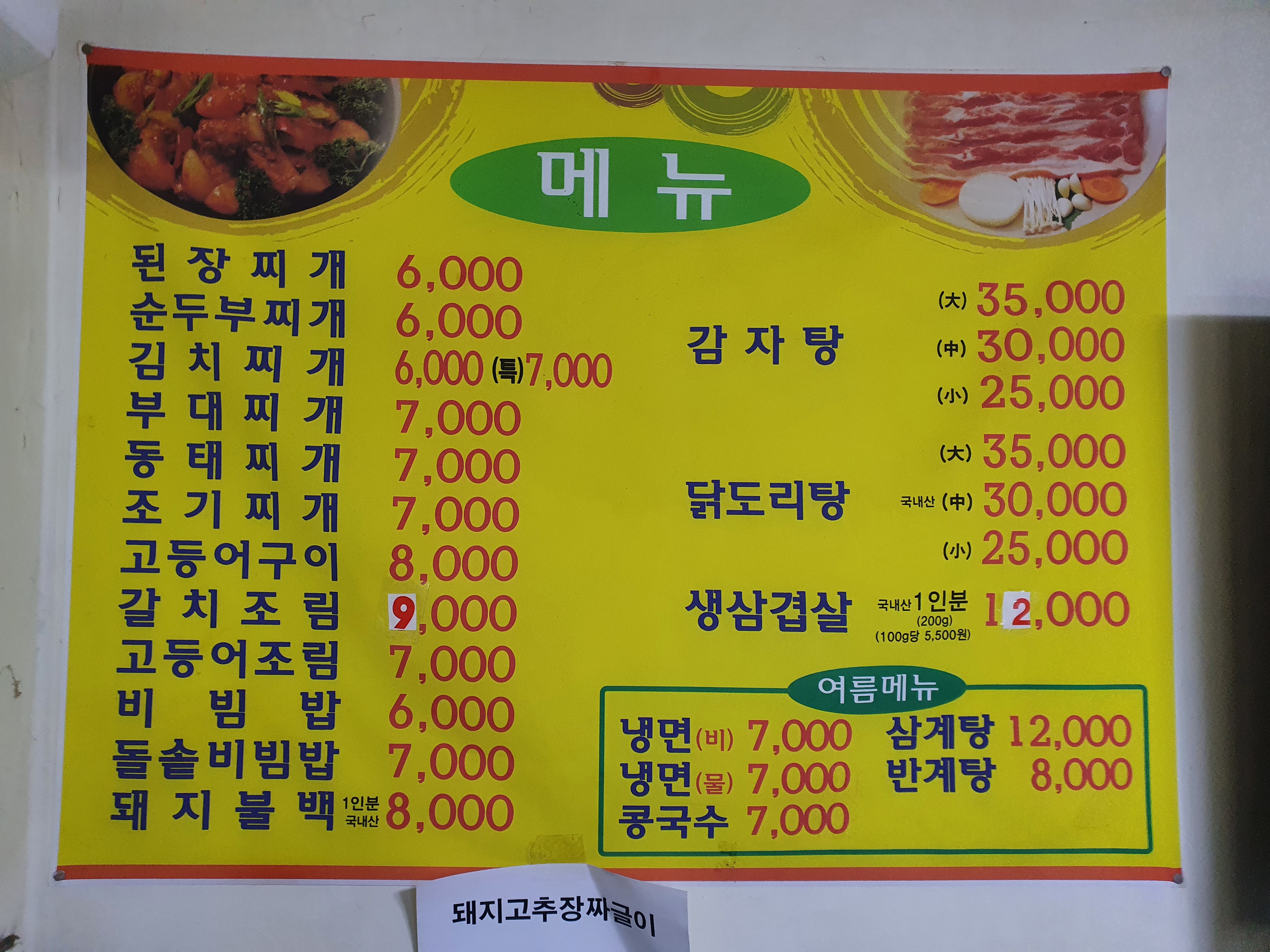 메뉴입니다. 된장찌개, 순두부찌개, 김치찌개, 부대찌개, 동태찌개, 조기찌개, 고등어구이, 갈치조림, 비빕밥, 돌솥비빔밥, 돼지불백, 감자탕, 닭도리탕, 생삼겹살까지 맛있는 한식 메뉴가 풍성하게 있습니다.