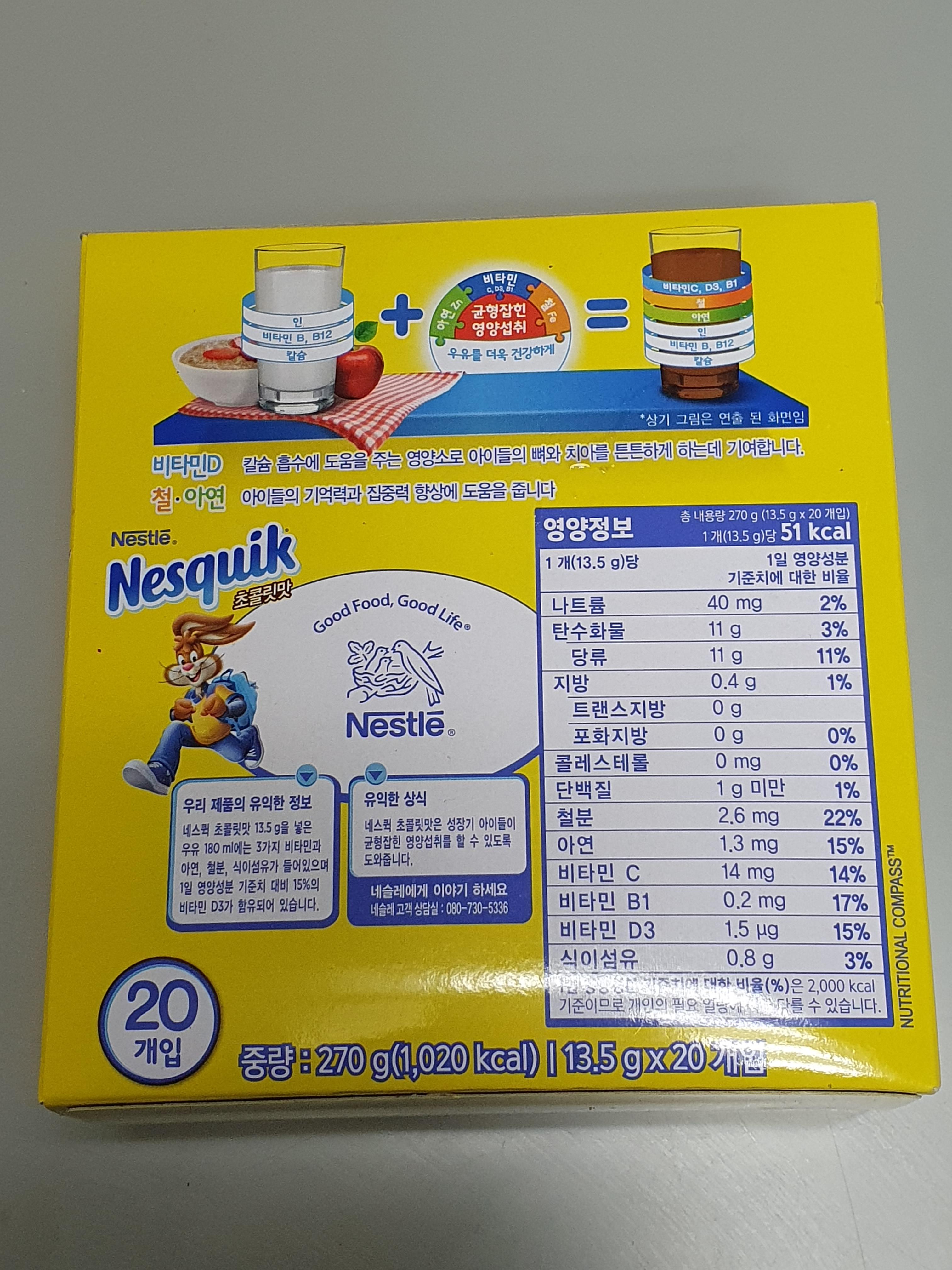 아이들은 참 좋아하지만 자주 주고 싶지는 않은 초콜릿 음료죠. 그래도 직접 우유에 타서 마실 수 있고, 비타민D와 철, 아연이 포함되었다는 것이 위안을 삼습니다.