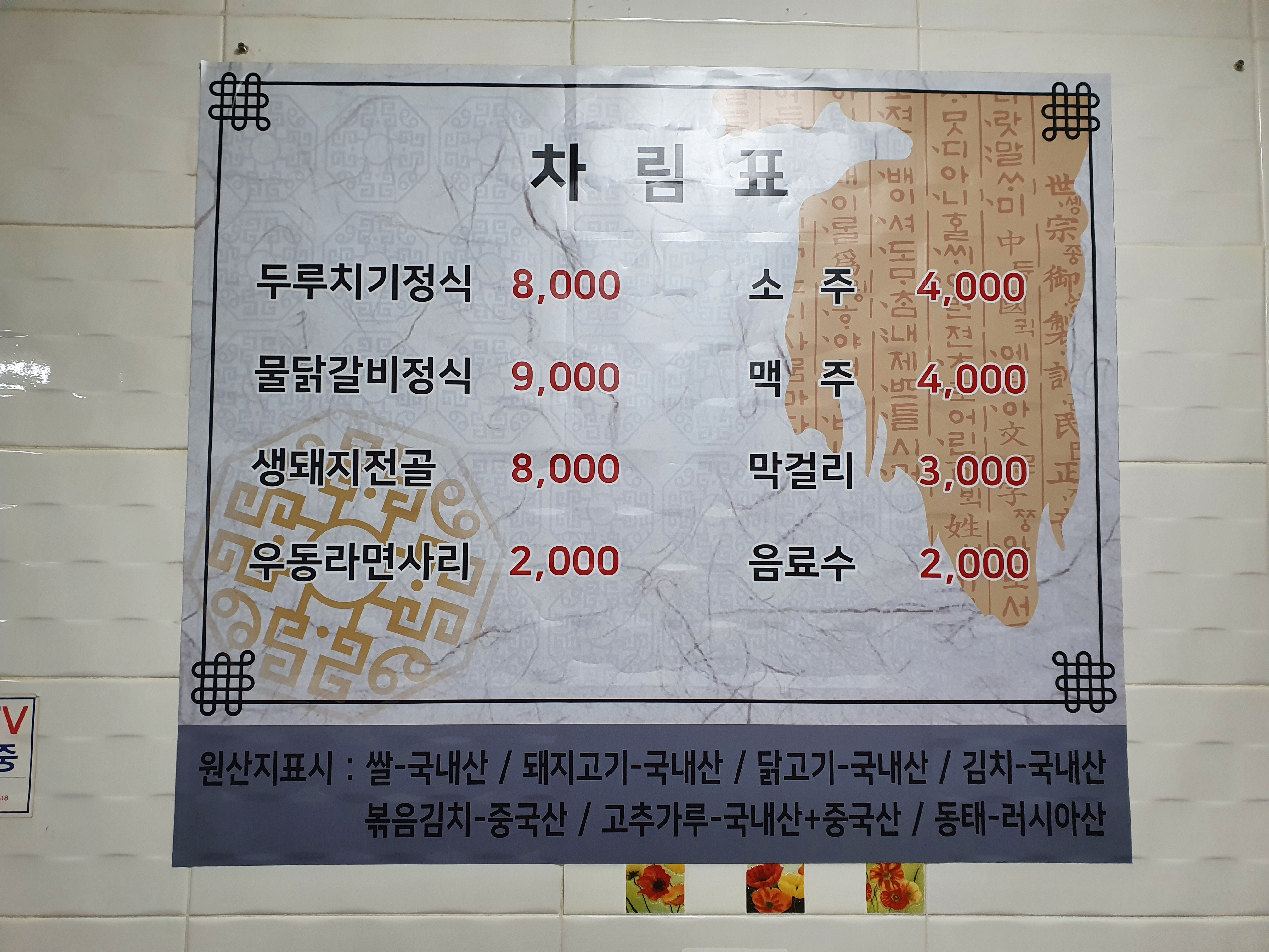 메뉴는 두루치기정식, 물닭갈비정식, 생돼지전골이 있습니다.