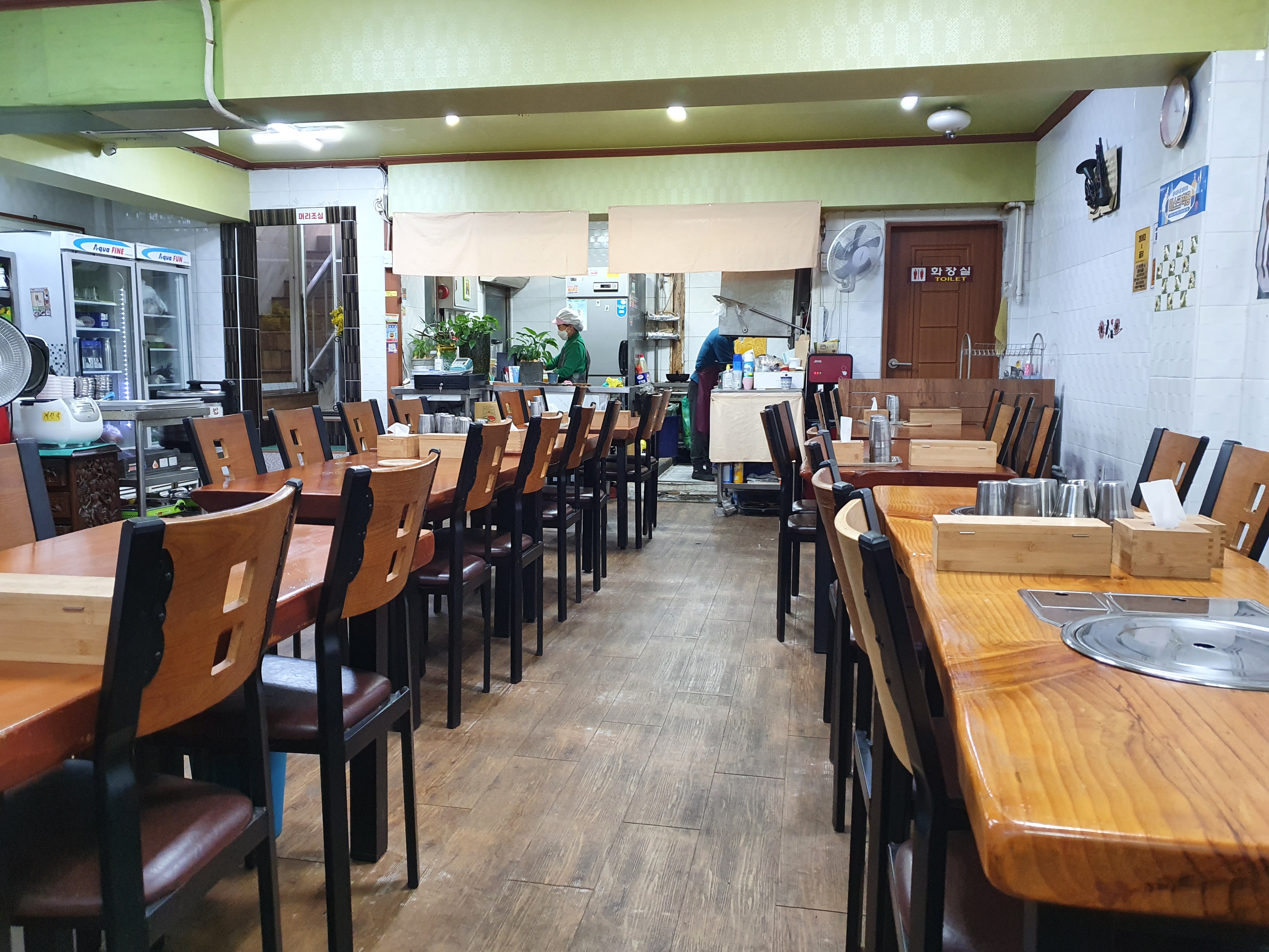 식당은 지하에 있지만 넓고 깨끗합니다.