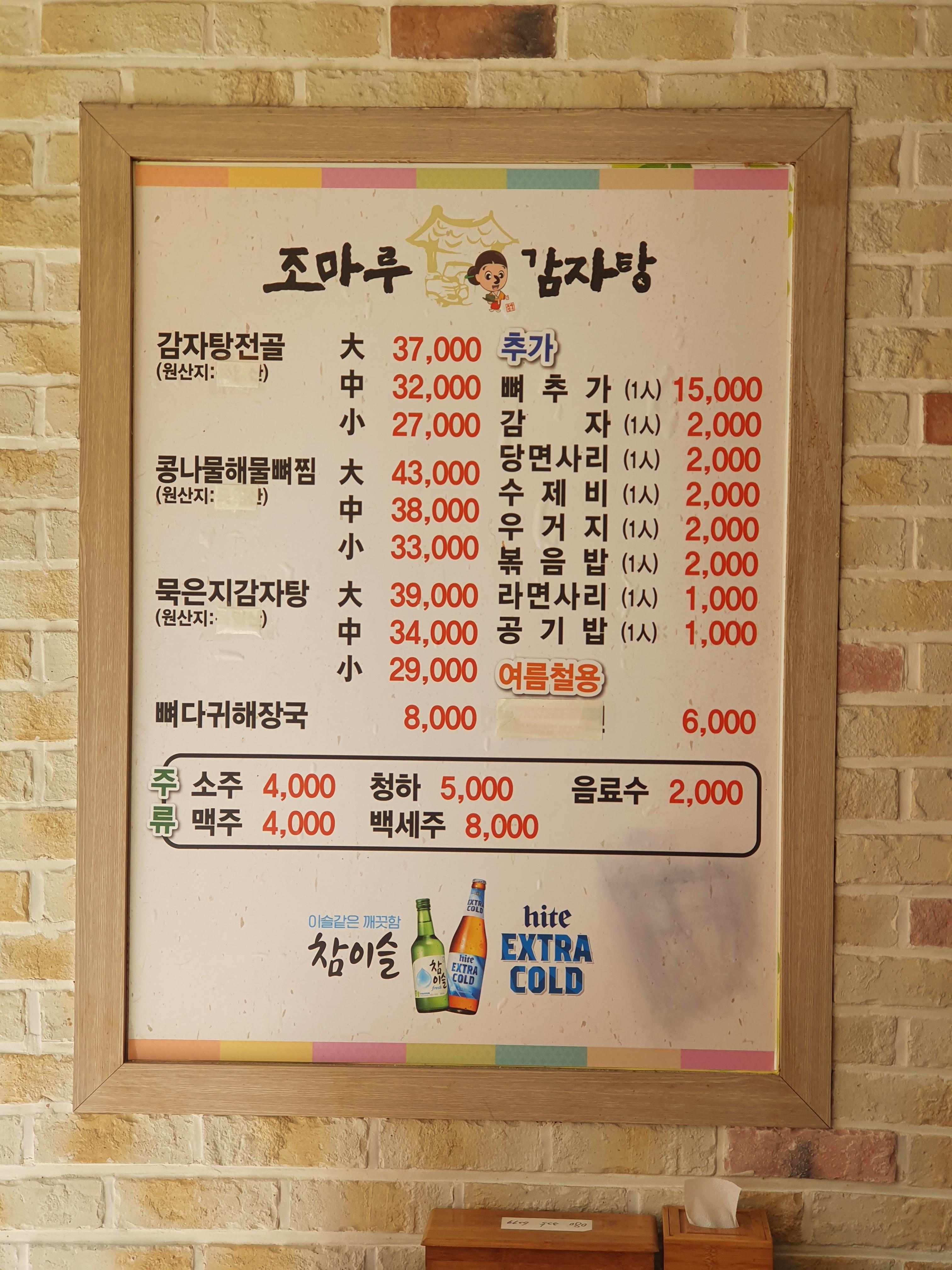 조마루 감자탕 메뉴판입니다. 다음에는 여러명이서 감자탕전골을 한번 먹어보고 싶네요!