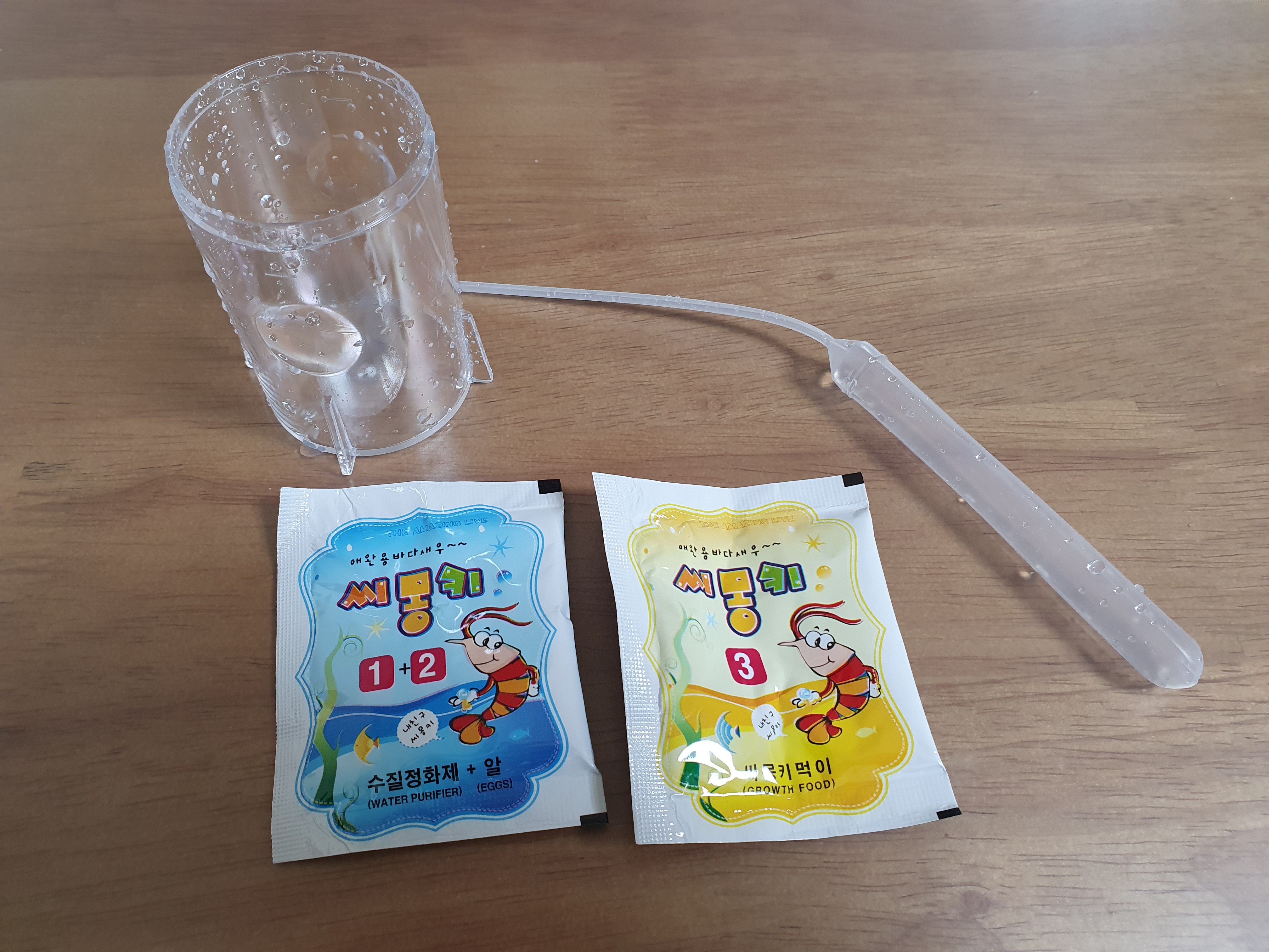 플라스틱으로 된 작은 어항, 수질정화제 + 알, 씨몽키 먹이, 공기를 넣어주는 스포이드