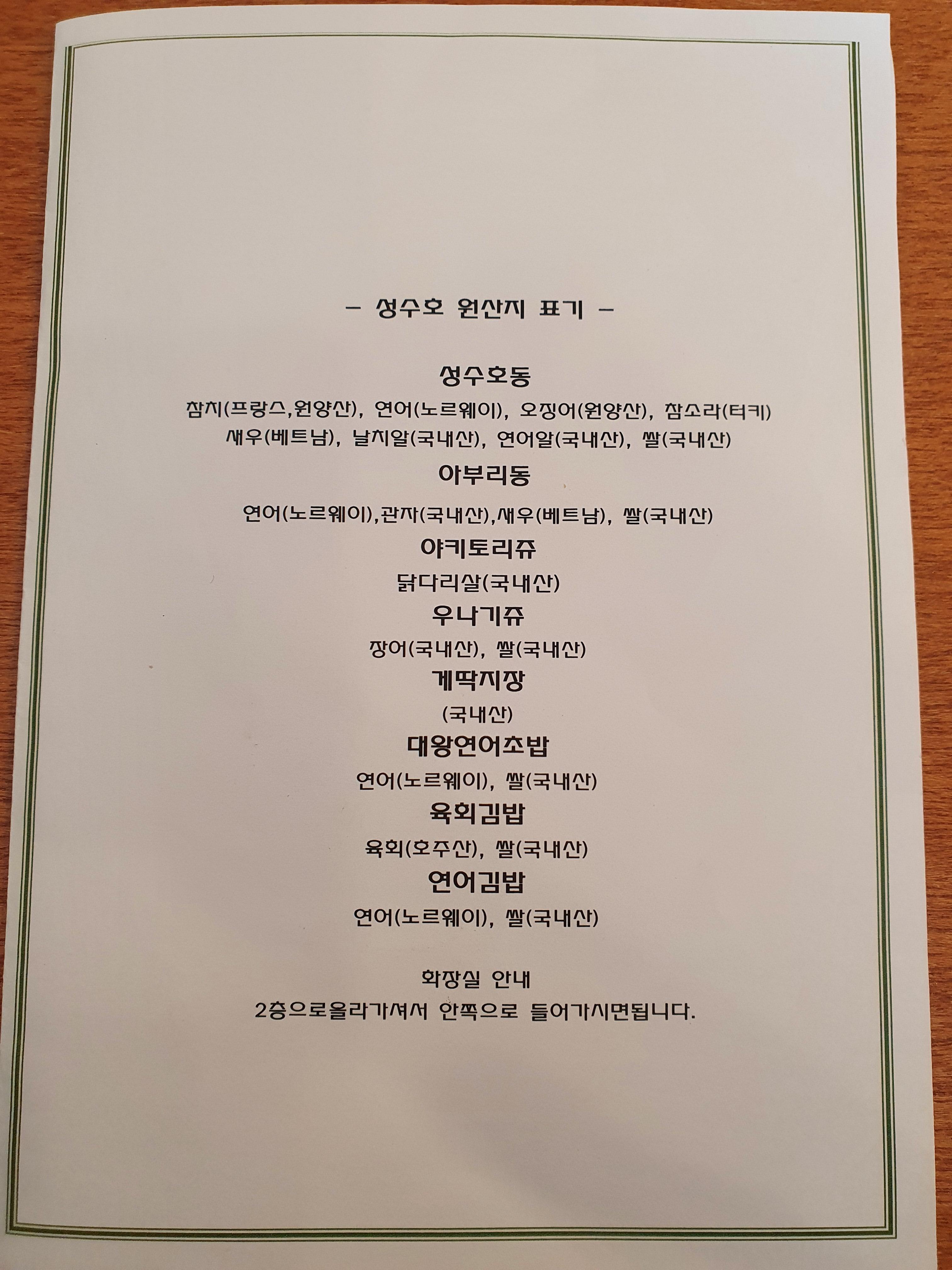 성수호 메뉴판입니다.