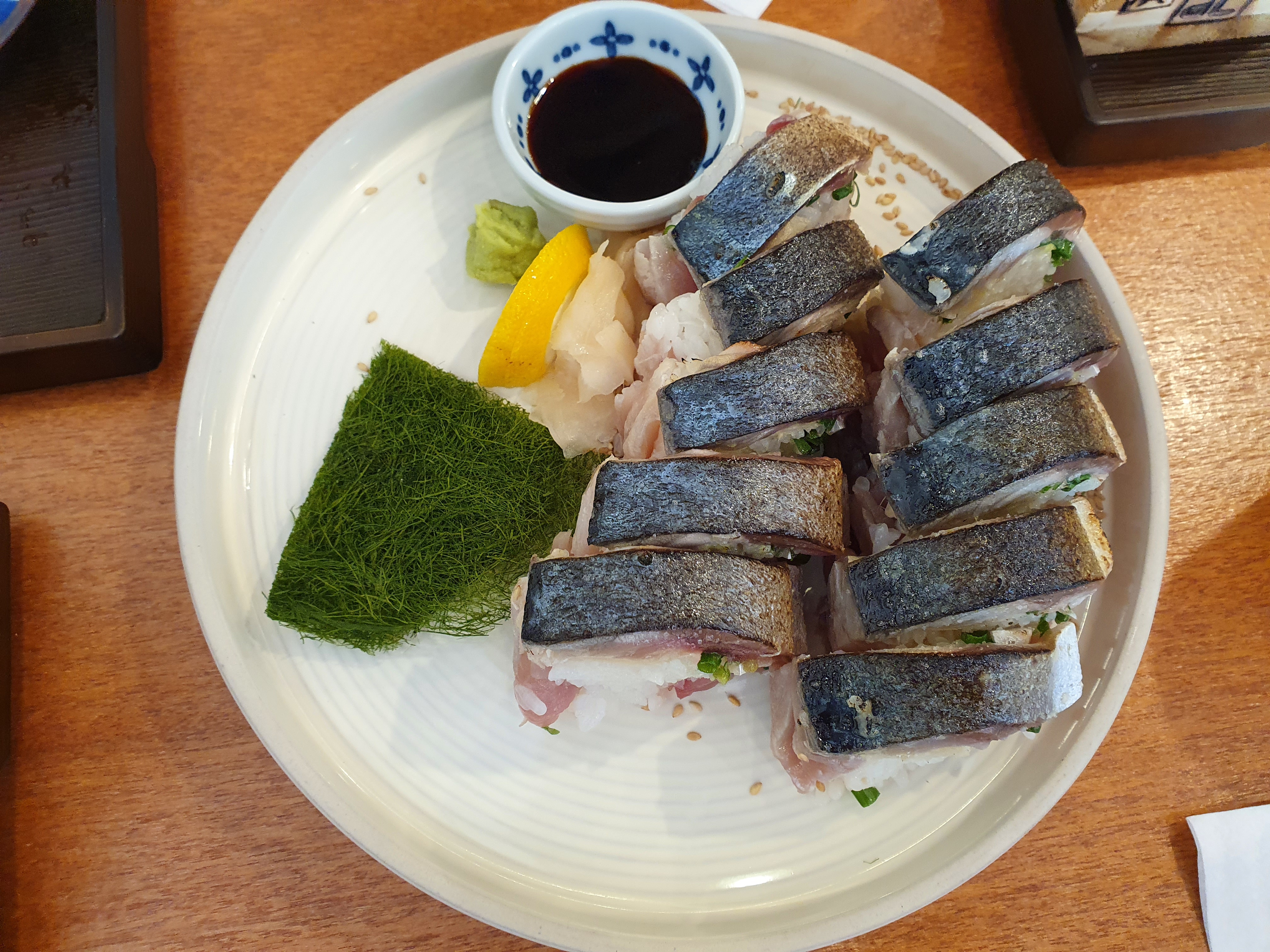 마지막메뉴입니다. 사바보우즈시로 고등어초밥입니다. 부산에서 공수해온 고등어에 성수호만의 시메즈에 숙성을 시켰다고합니다. 하루에 딱 10접시만 판매한다고합니다. 정말 비린내가 하나도 나지 않고 맛있습니다.