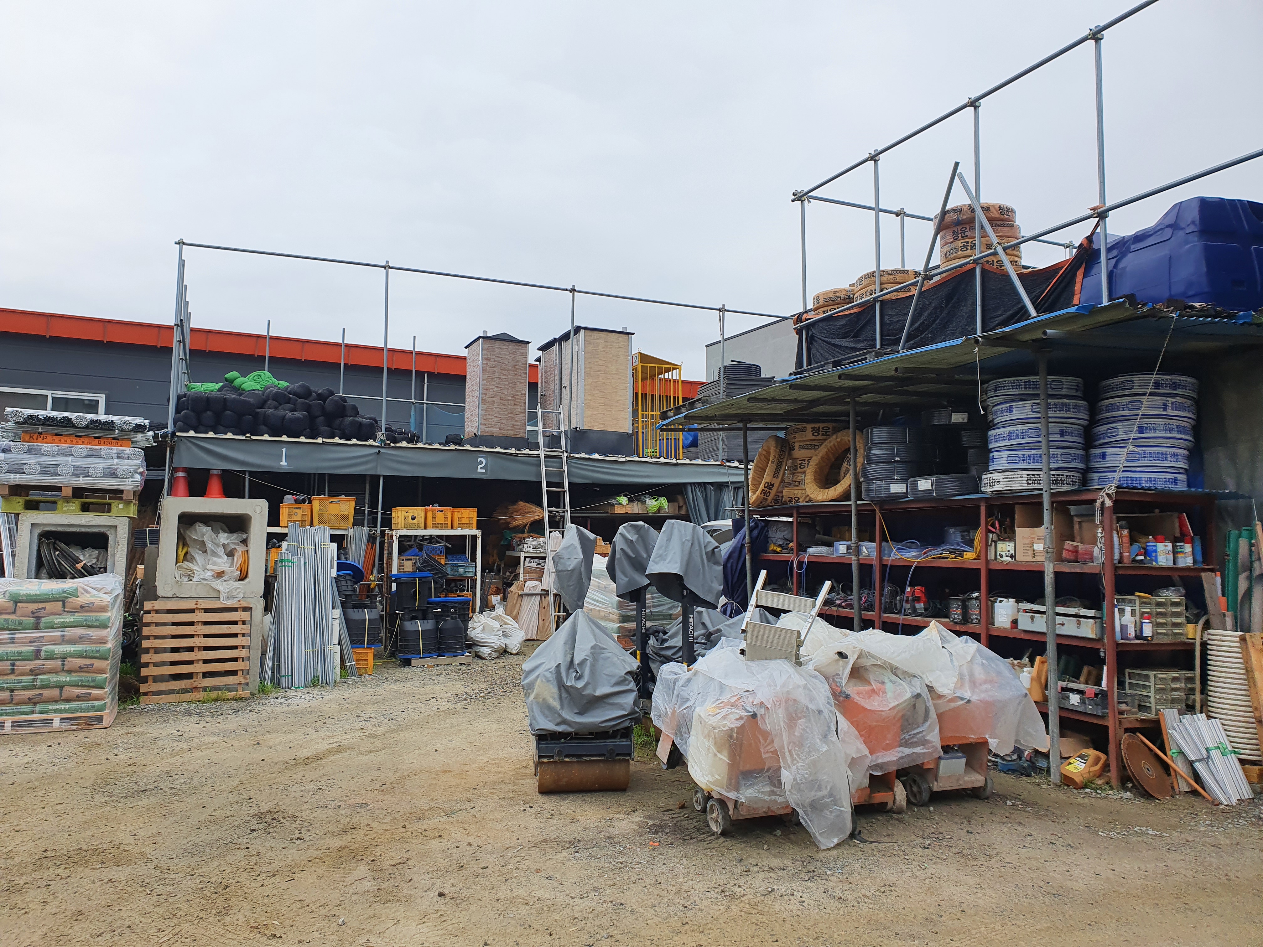 건설에 필요한 물건이 정말 다양하게 있는데 저쪽에 이동식 화장실도 보이네요!