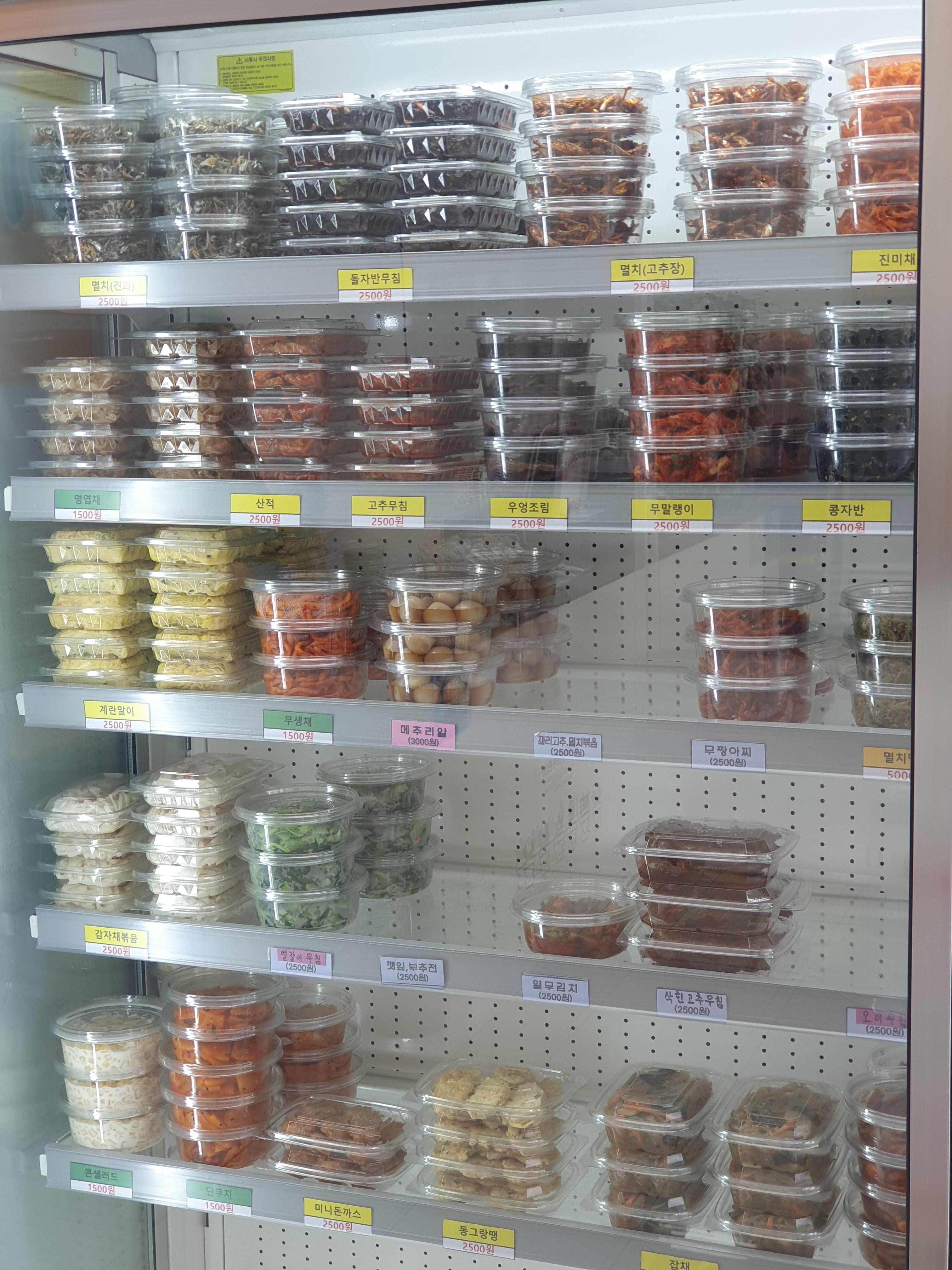 장조림, 고사리, 비엔나볶음, 연근조림, 겉절이, 고추잎무침, 느타리볶음, 알마늘장아찌, 참치김치볶음, 깻잎, 무나물, 단호박셀러드, 도라지무침, 소세지전, 두부무침, 오이냉국, 취나물, 콩나물, 뻔데기, 된장시레기, 미덕조무침, 미역줄기가 있습니다.