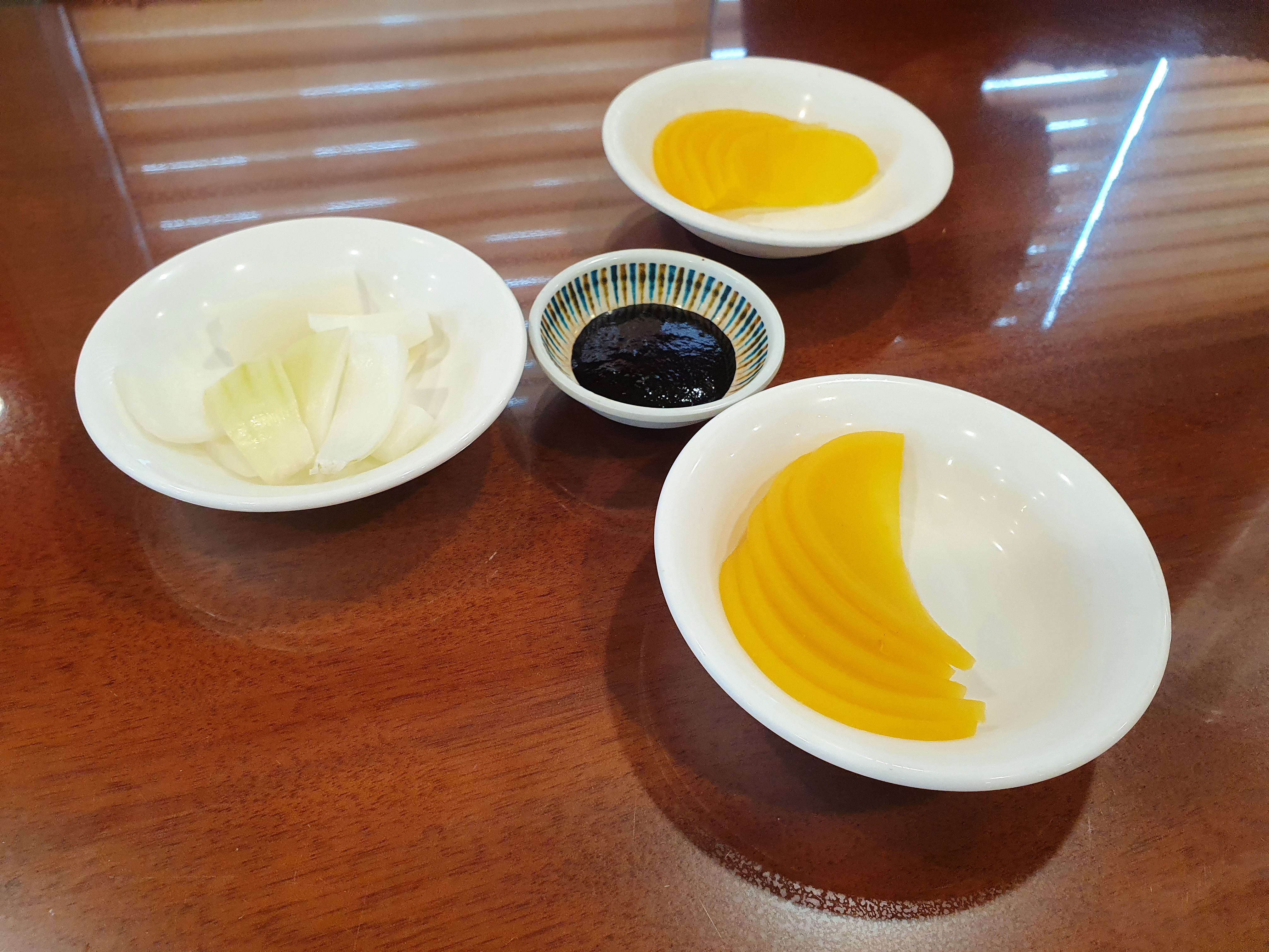 요리를 기다리는 동안 단문지와 양파가 나왔습니다.