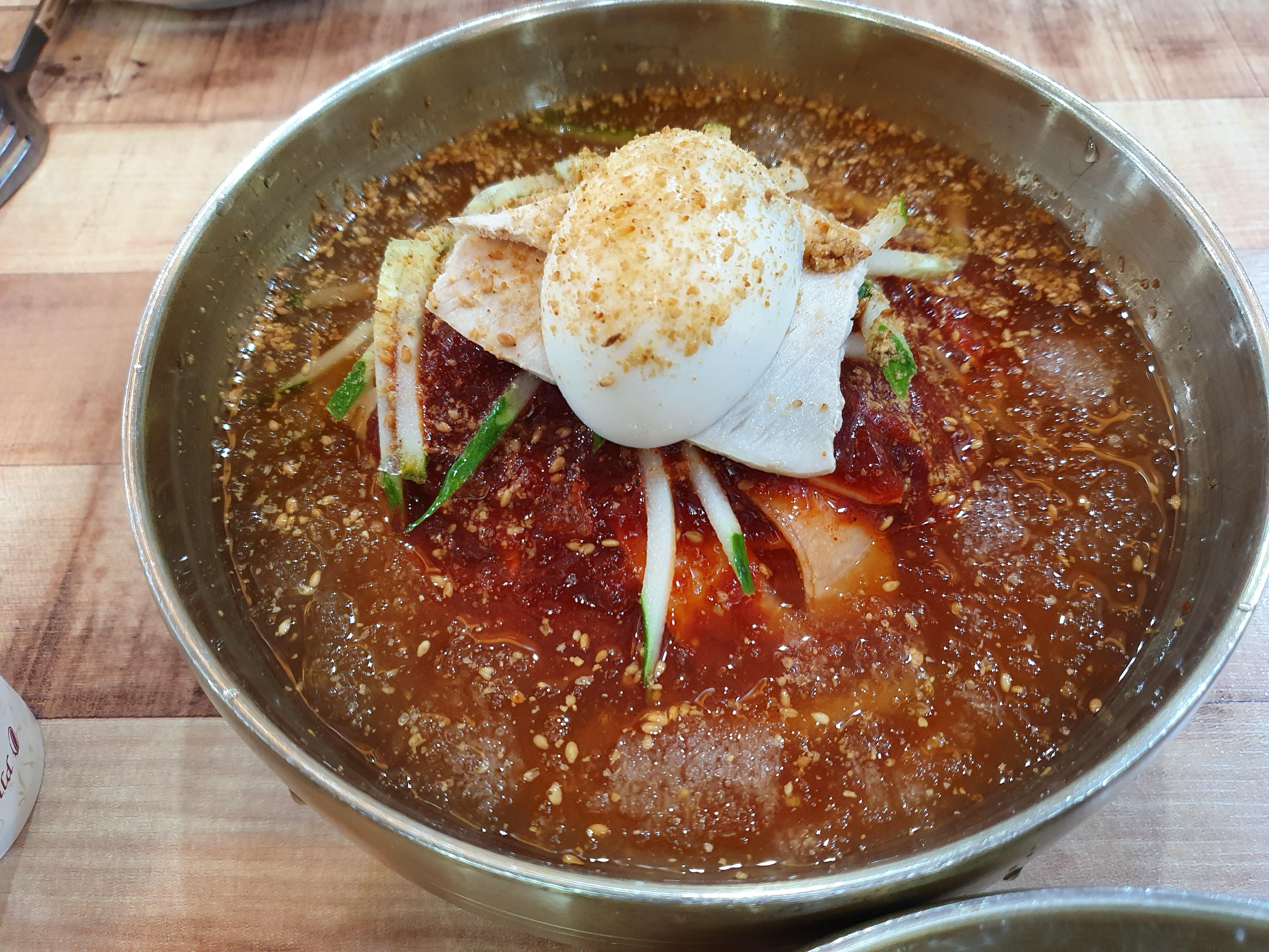 밀면입니다. 아이들이 먹을 수 있도록 매운양념을 빼달라고 했습니다.