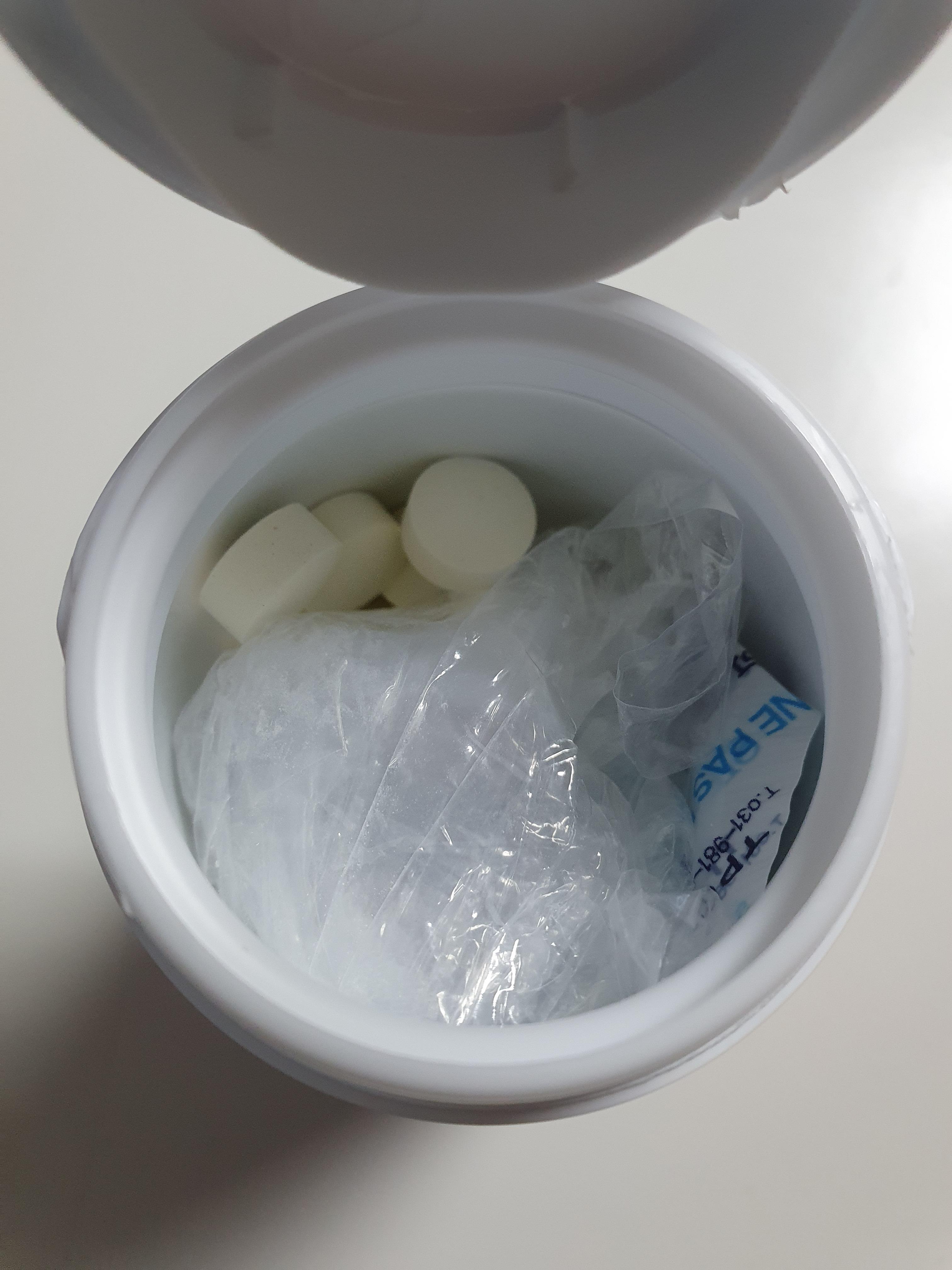 통안에는 동그란 엽산이 들어 있고. 산소를 차단하기 위해서 비닐과 산소제거제가 들어 있습니다.