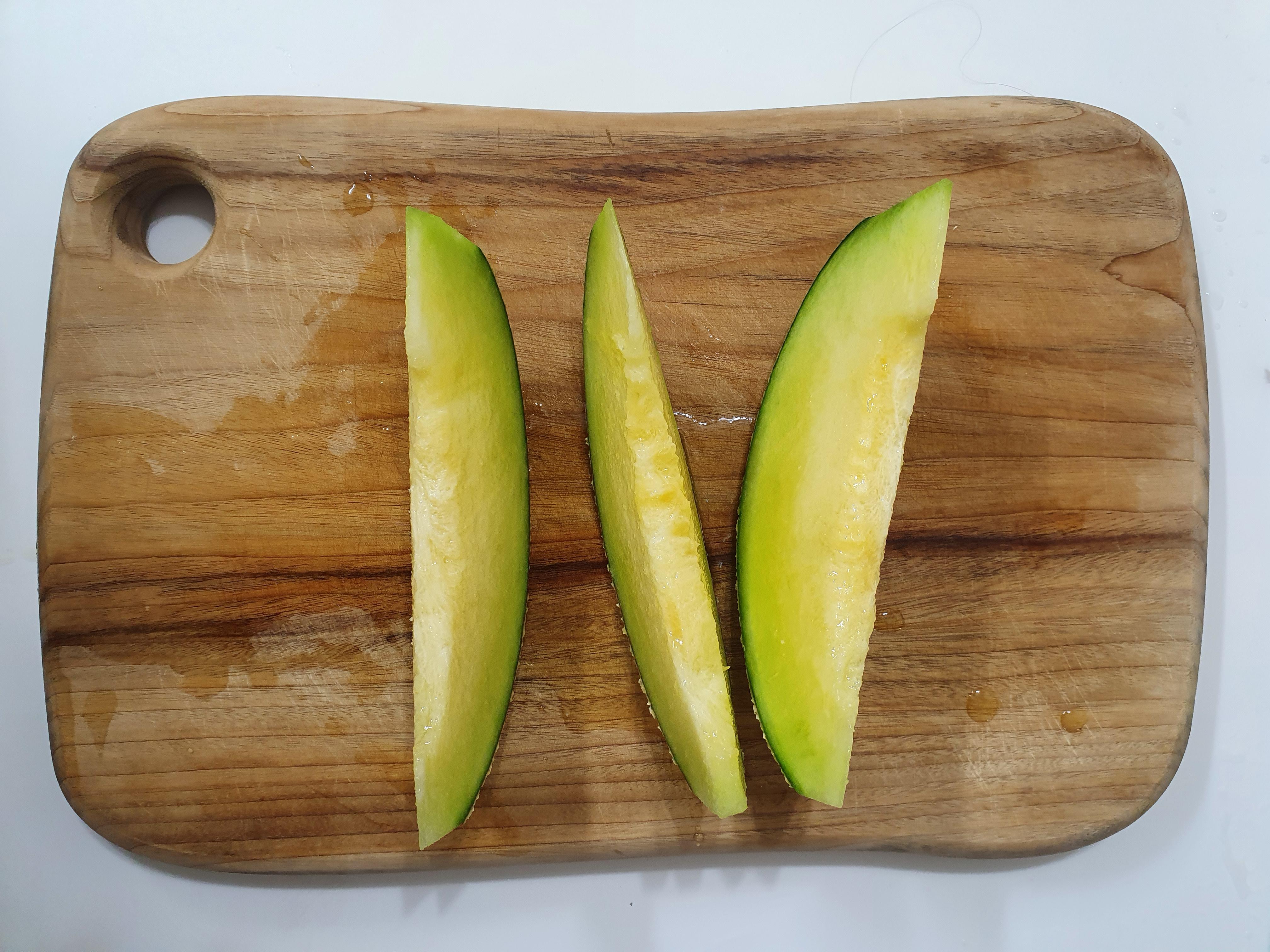 3. 4등분한 멜론 한조각을 다시 3조각으로 잘라줍니다.