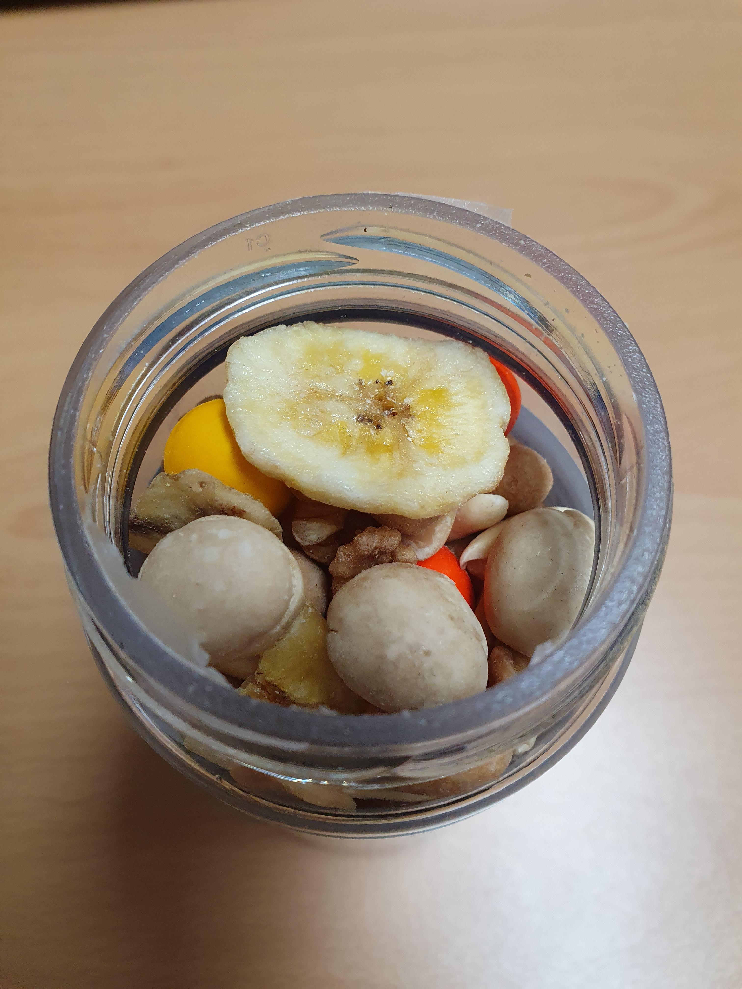 커피맛땅콩, 바나나칩, 볶음땅콩, 땅콩초코볼, 호두 등이 들어 있습니다.