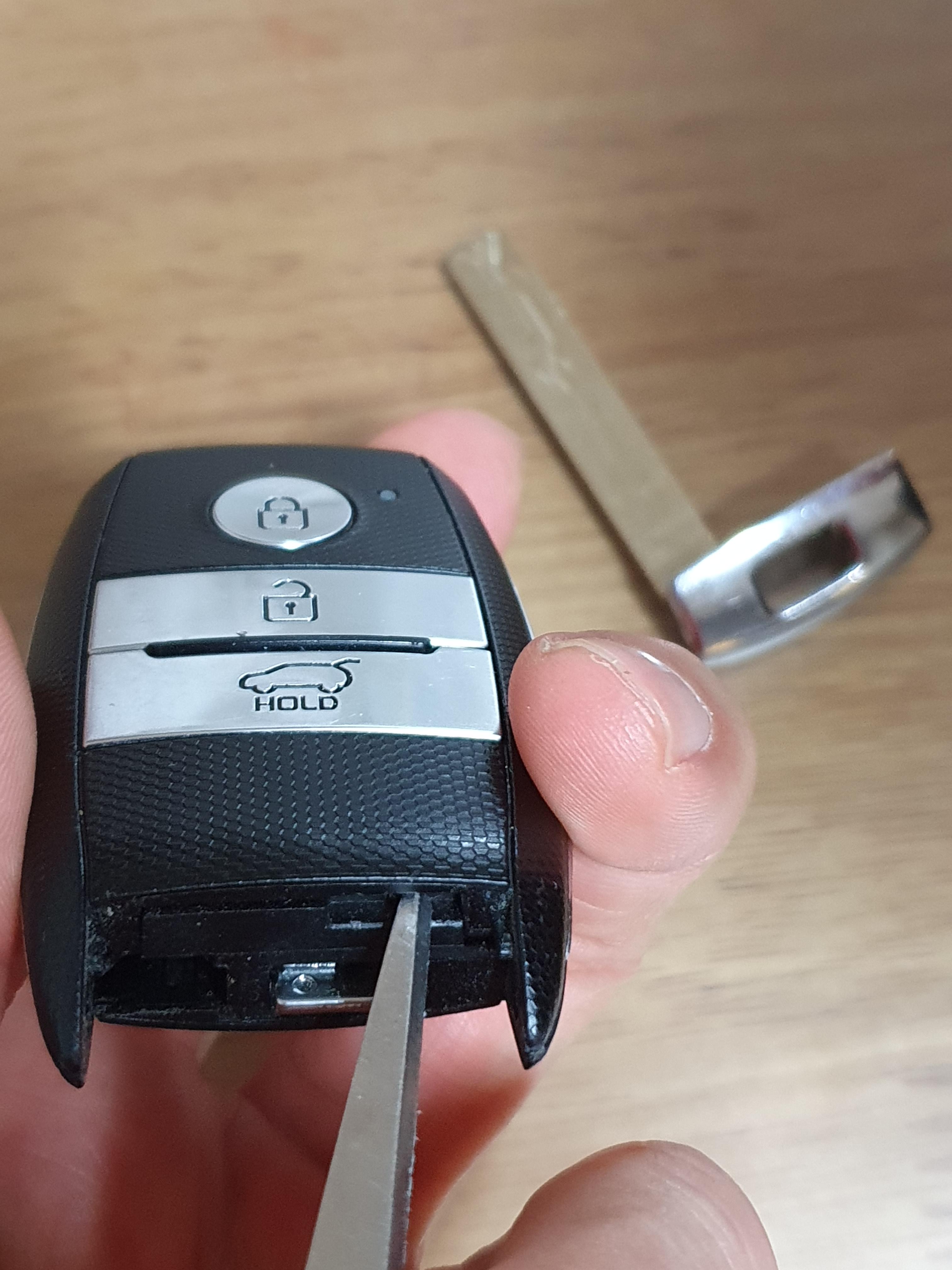 비상키를 빼고서 안쪽을 보면 자동차키 뚜껑을 열수 있는 네모난틈이 있습니다.
