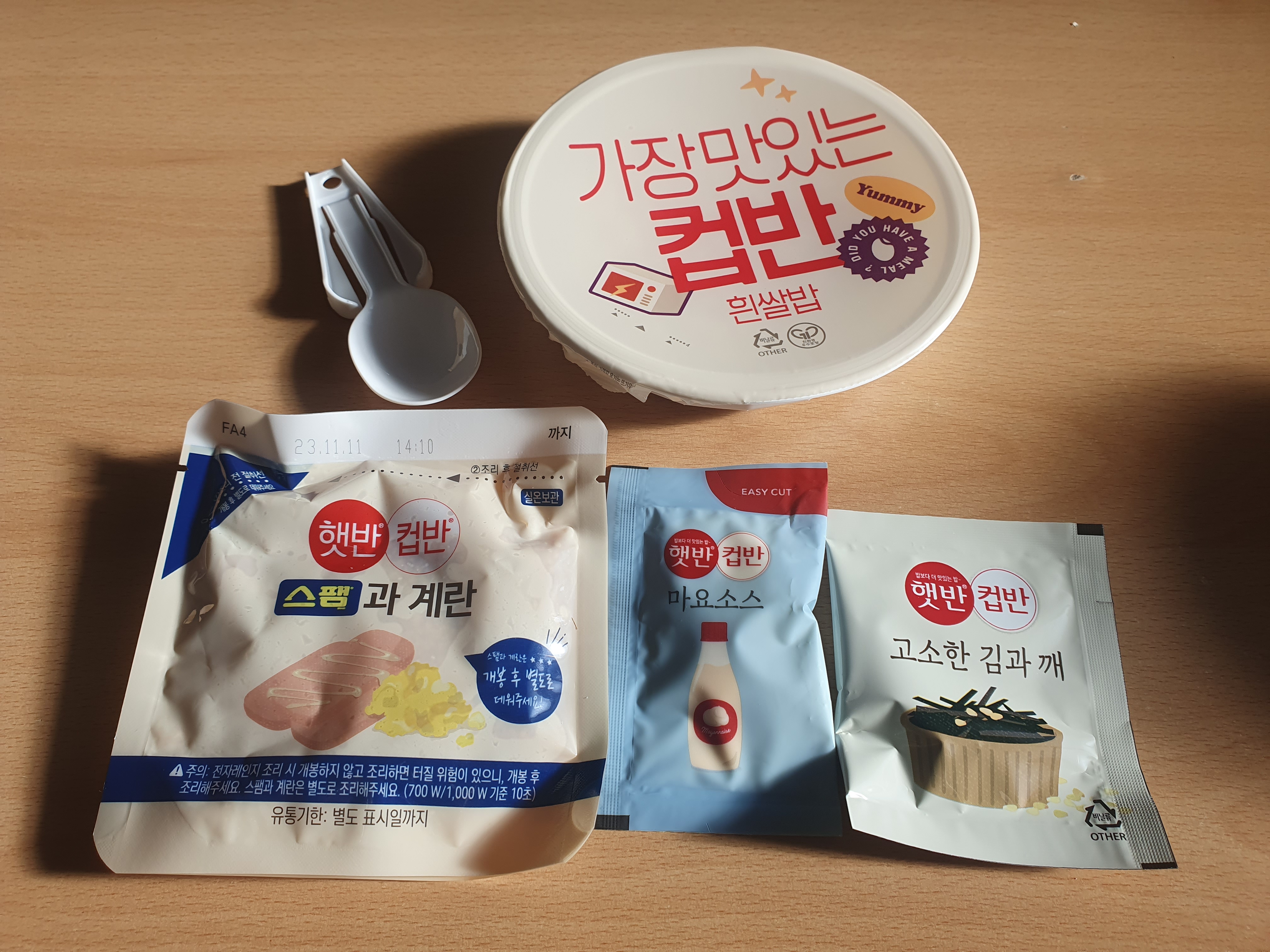 햇반부터 숟가락 스팸과 계란, 마요소스, 고소한 김과 깨까지 들어 있습니다.