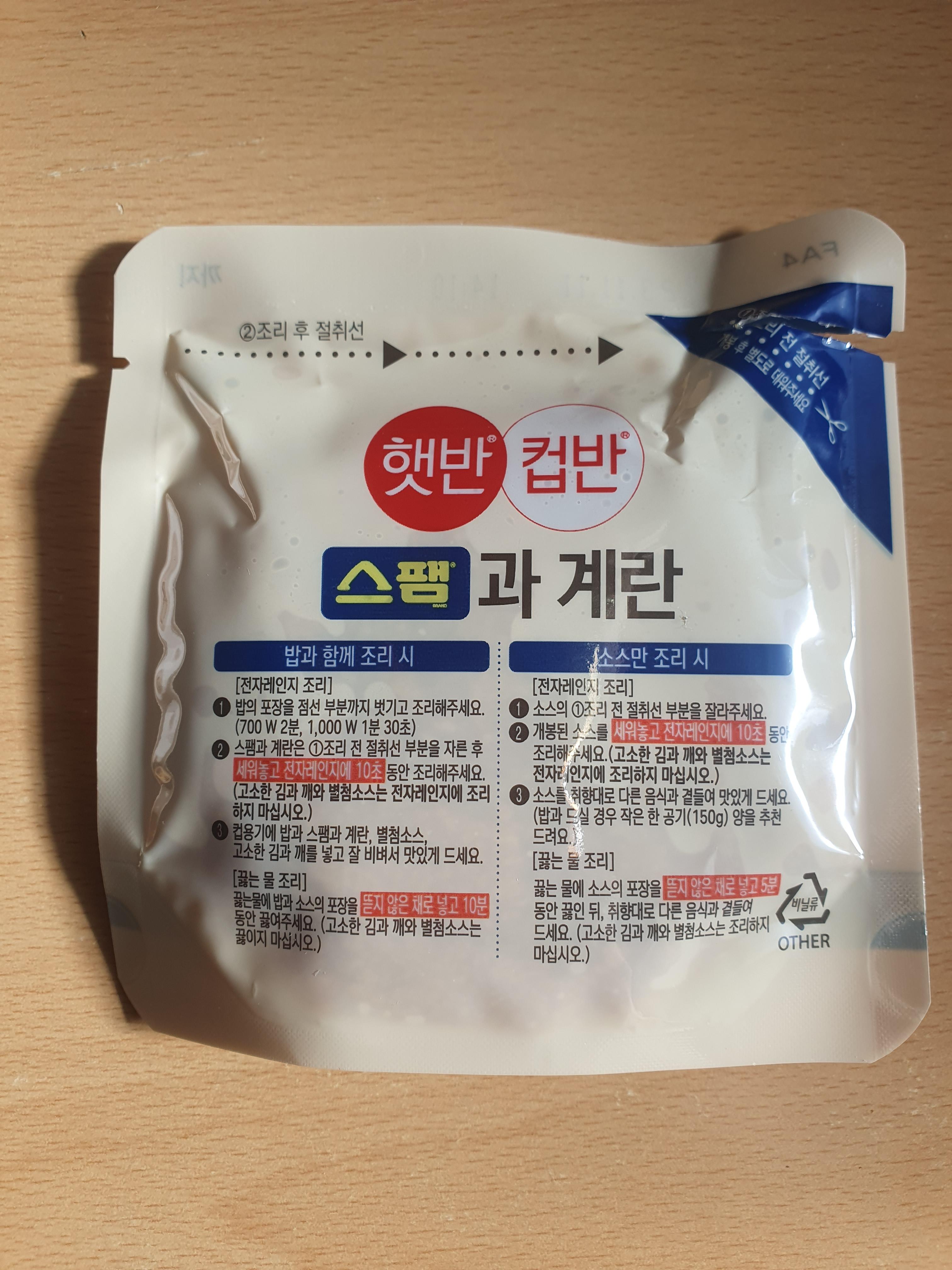 이어서 스팸과 계란입니다. 파란색 절취선까지만 개봉을 하고서 전자렌지에 10초만 돌려줍니다.