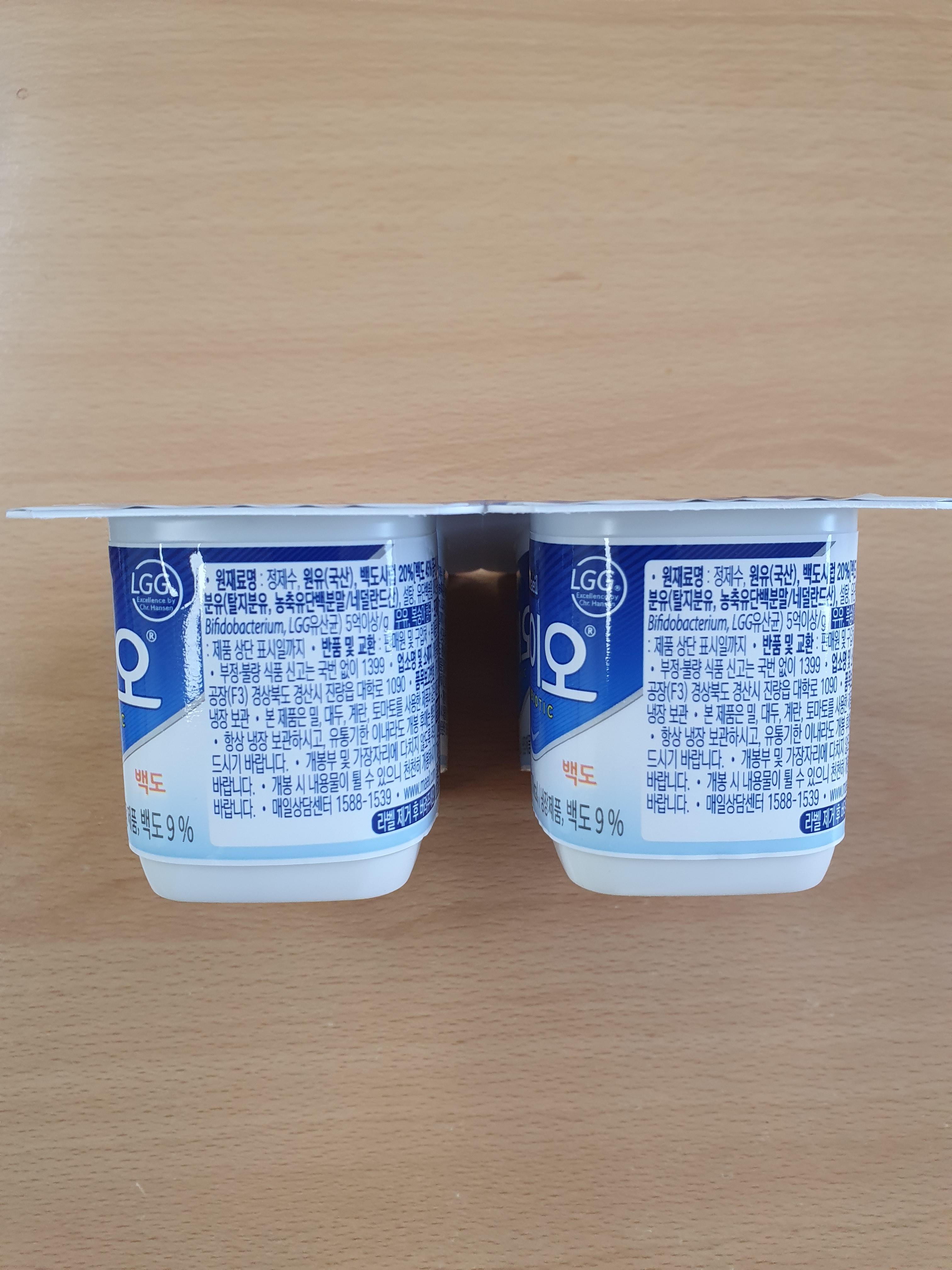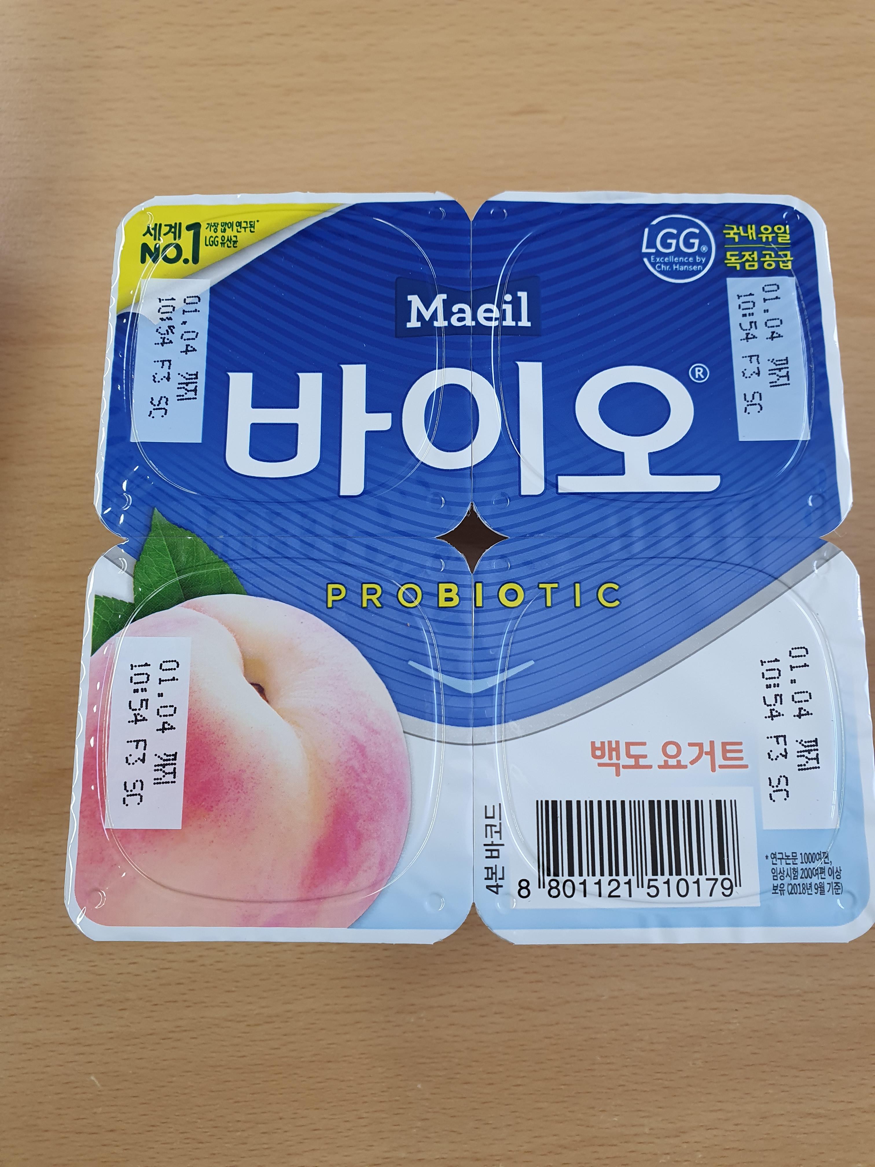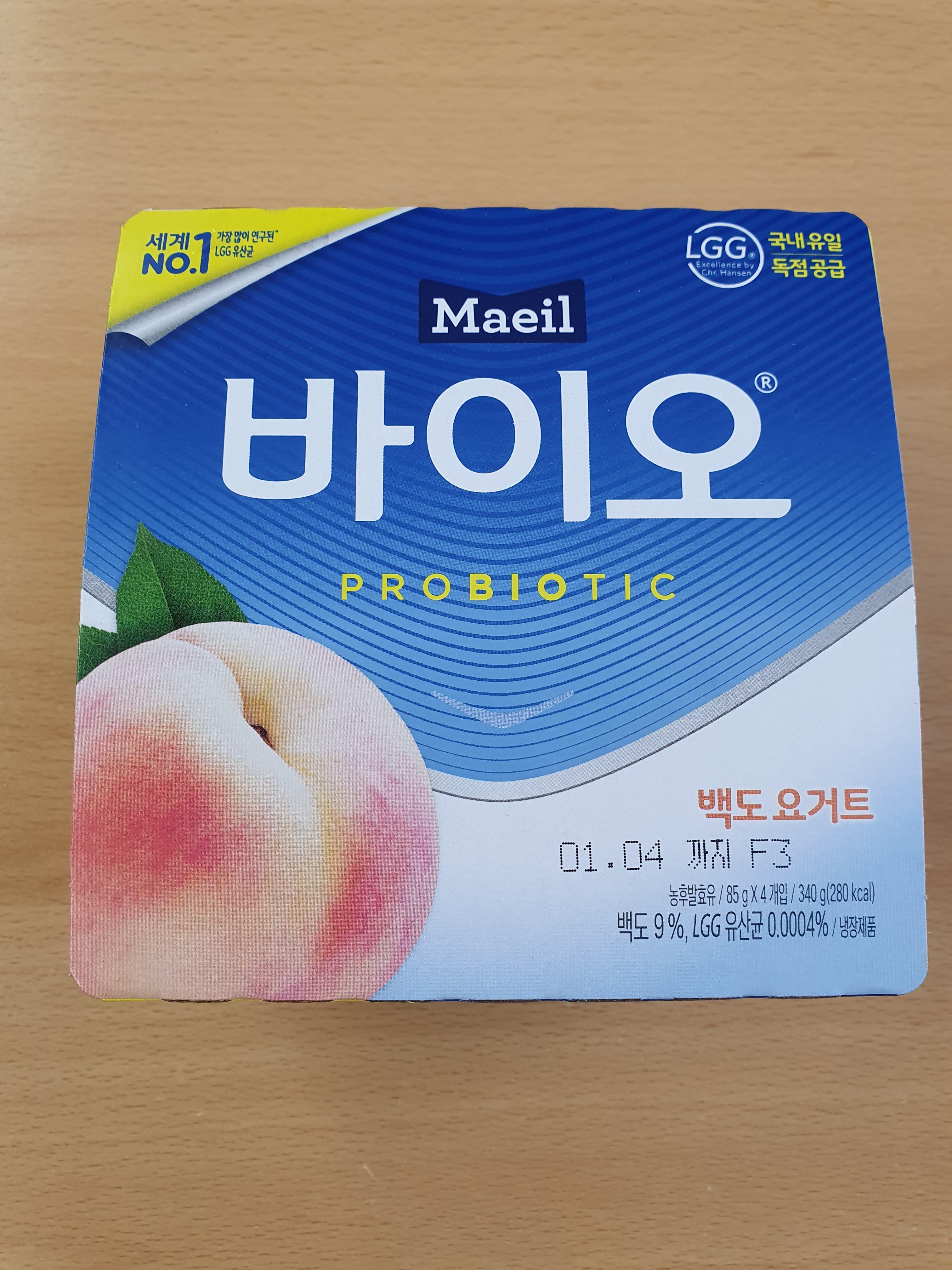매일유업에서 나오는 바이오 백도 요거트인데, LGG 유산균이 들어 있어서 즐겨 먹는 요거트입니다.