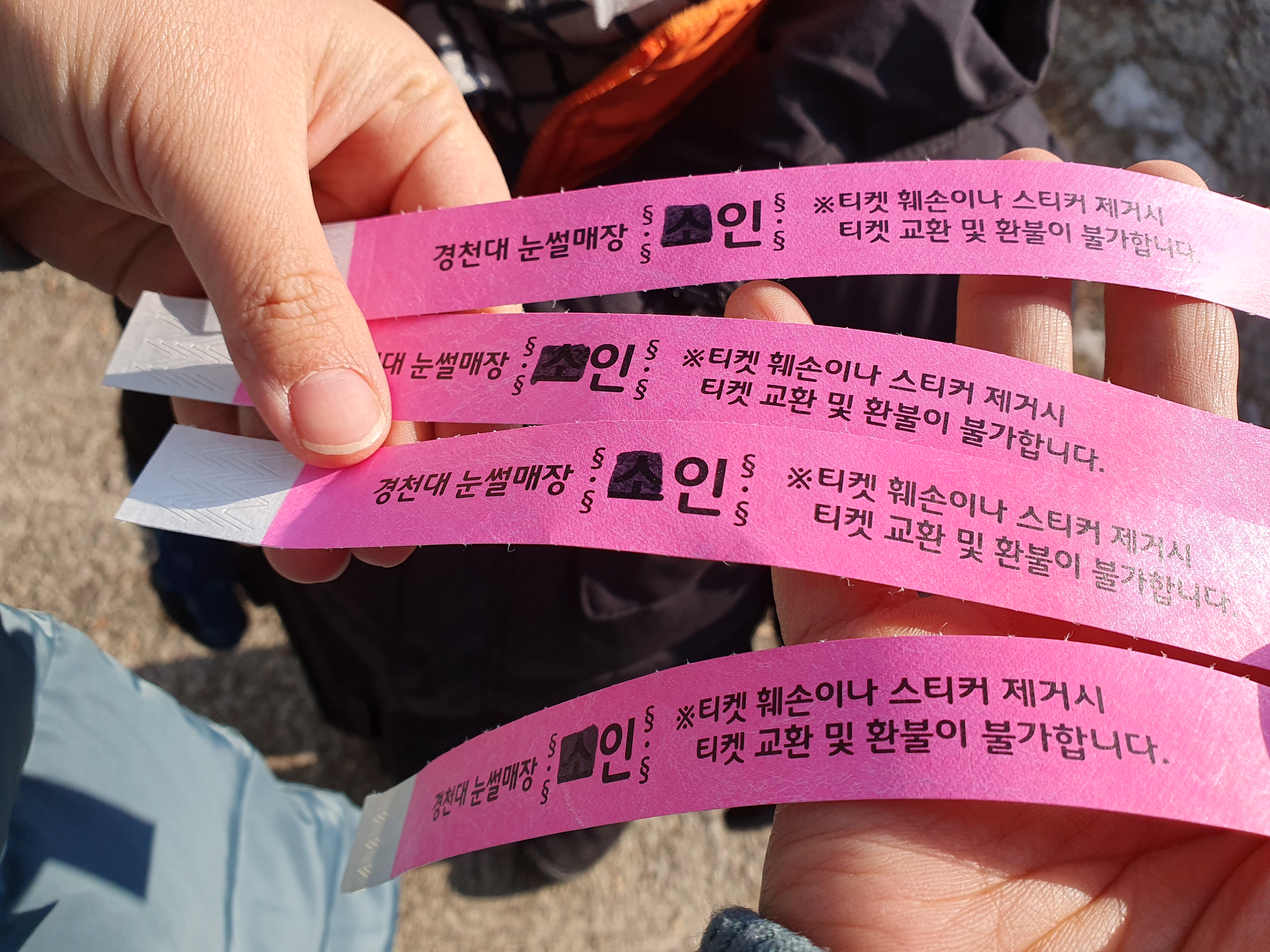 티켓을 구입하면 이렇게 손목 스티커를 줍니다. 매점에 나갔다가 재입장할때 필요하니 바로 손목에 채워줍니다.