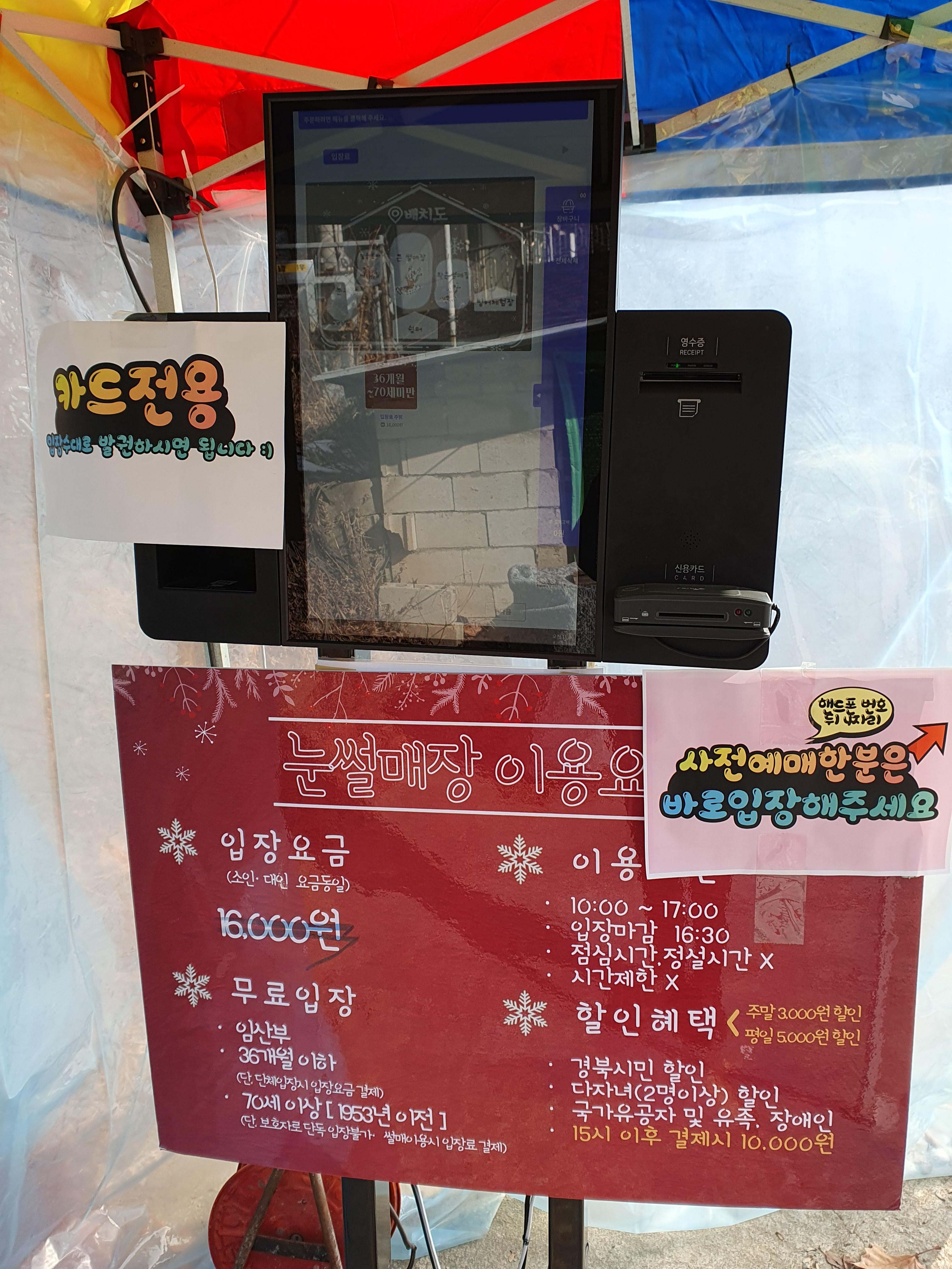 눈썰매장 입구 키오스크에서 티켓을 구매할 수 있습니다.
