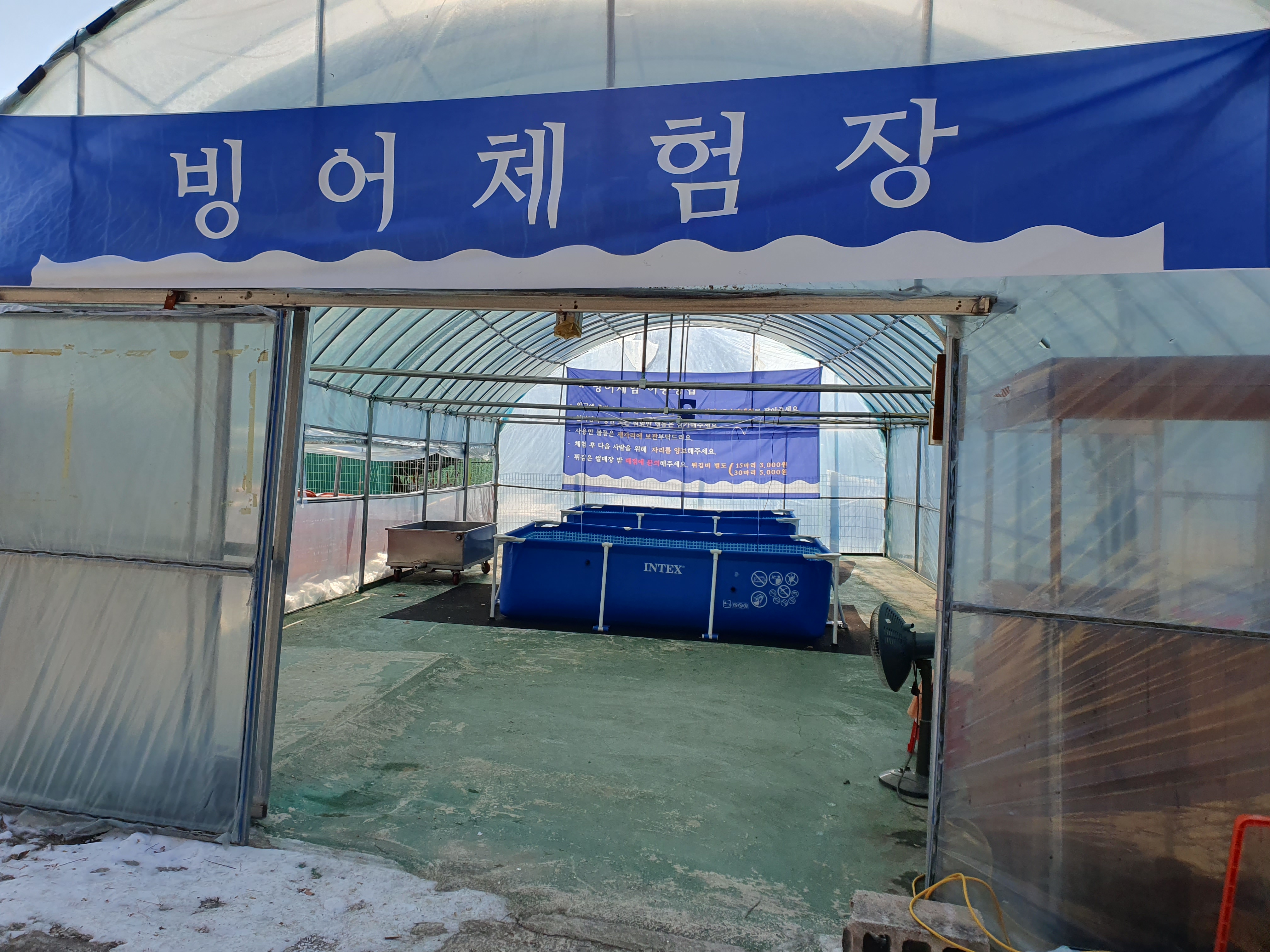 신나게 1시간 정도를 놀고 나서 배고파서 매점을 가다가 빙어체험장을 찾았습니다.