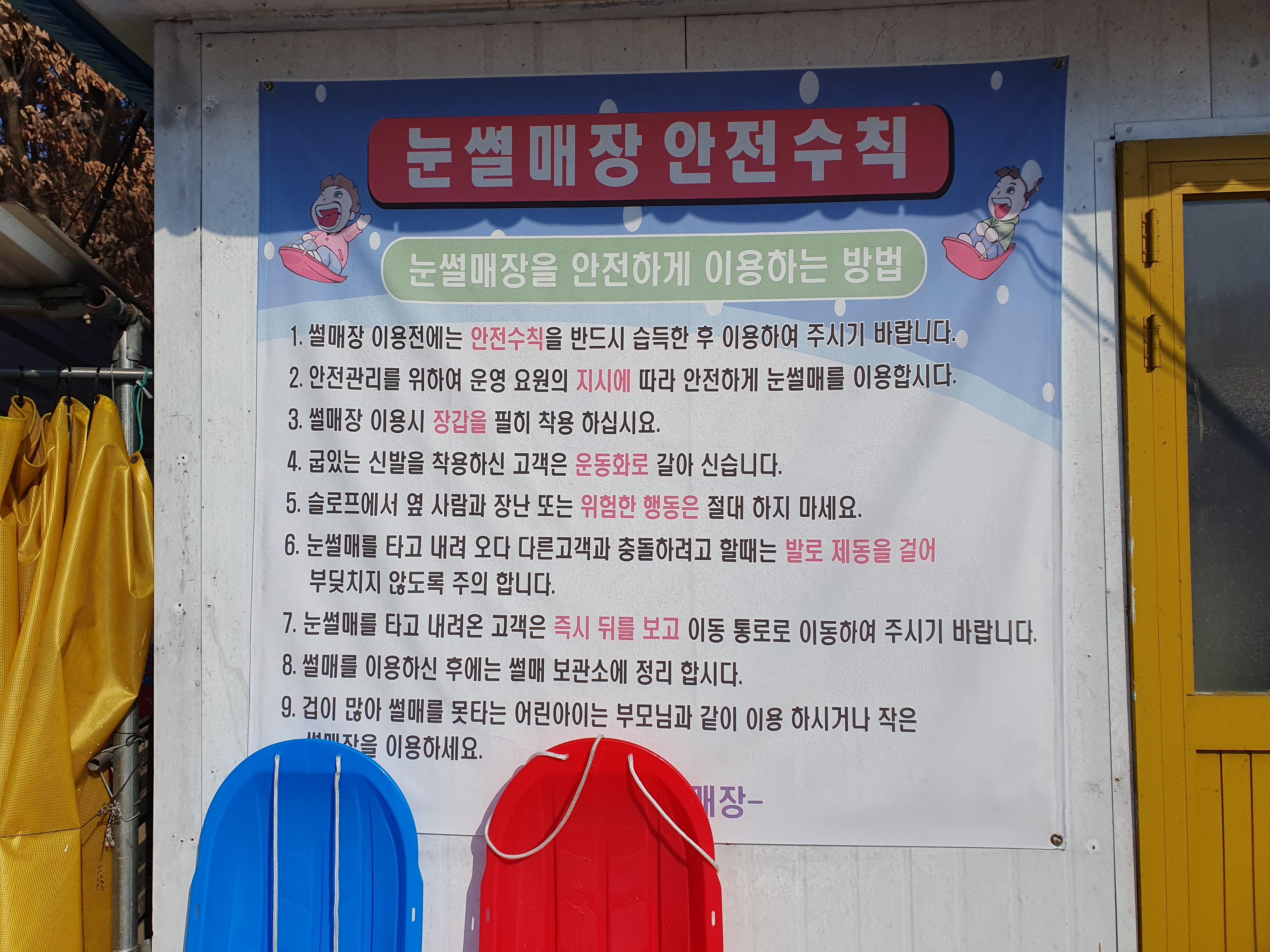 눈썰매장 안전수칙도 한번 읽어줍니다.