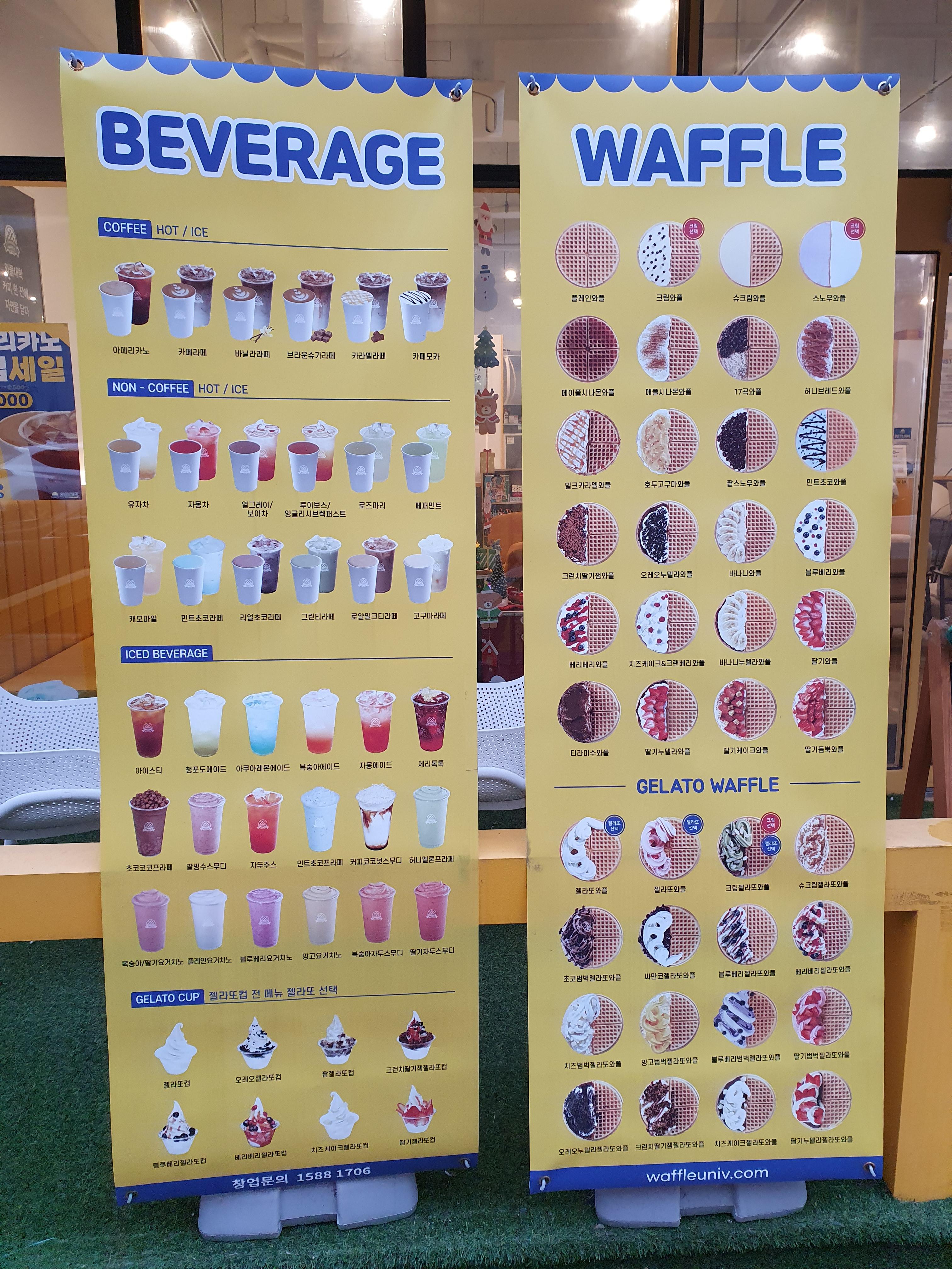 와플대학 메뉴판입니다. 와플은 물론이고 커피와 차 그리고 젤라또 아이스크림까지 많은 종류를 팔고 있네요~