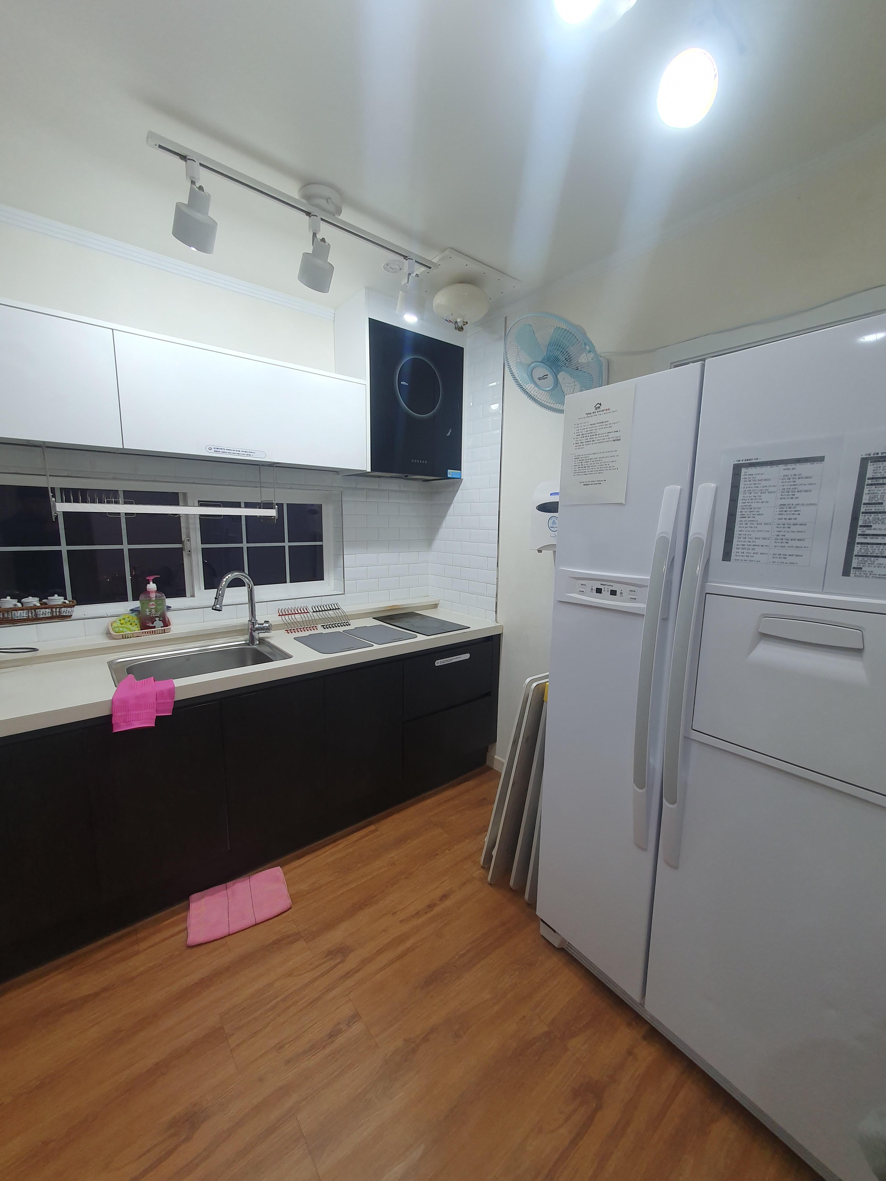 주방 모습입니다. 냉장고도 있고, 음식을 해먹을 수 있는 모든 것들이 갖춰져 있습니다.