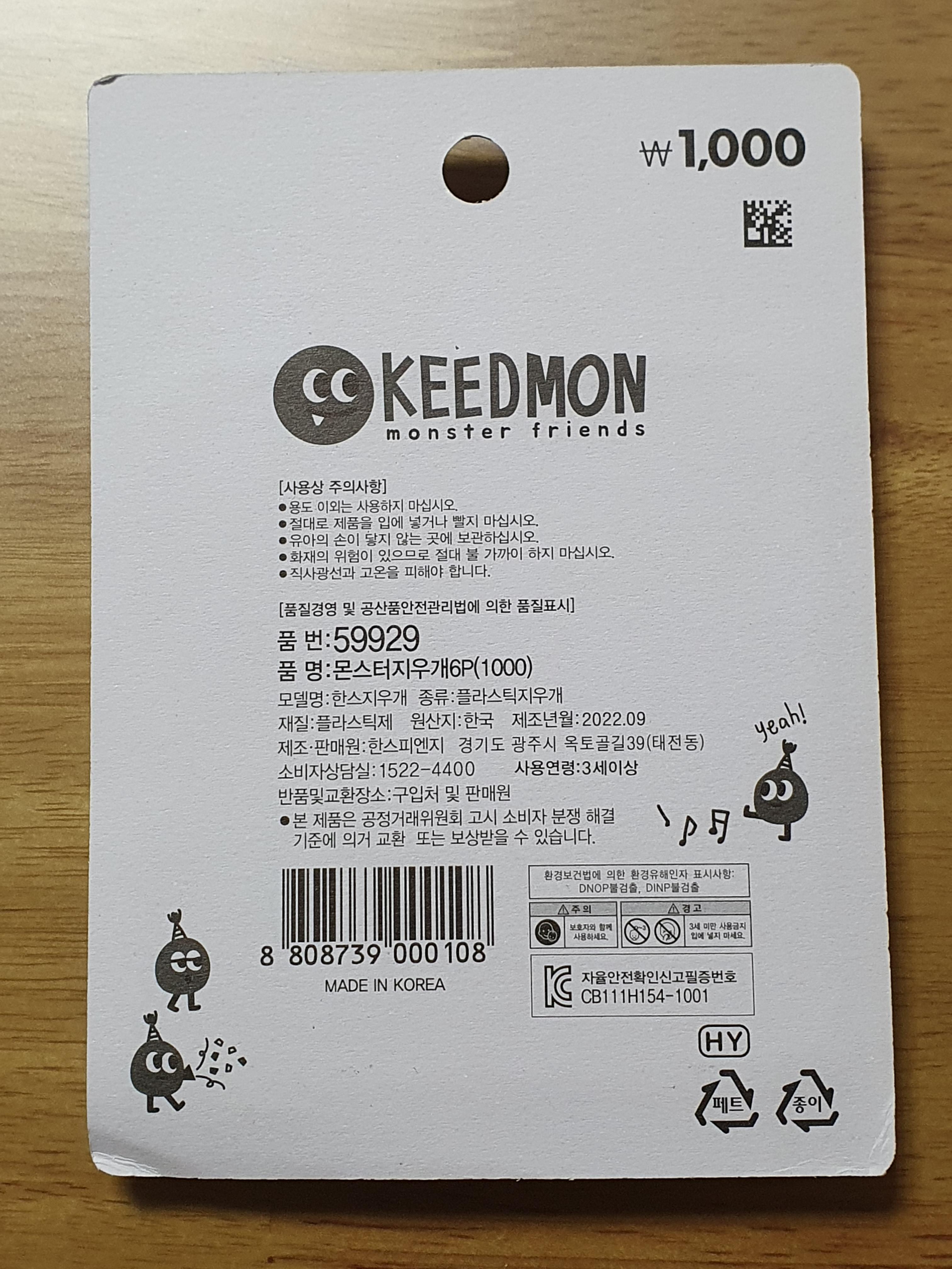 다이소 품명 : 몬스터지우개6P(1000)