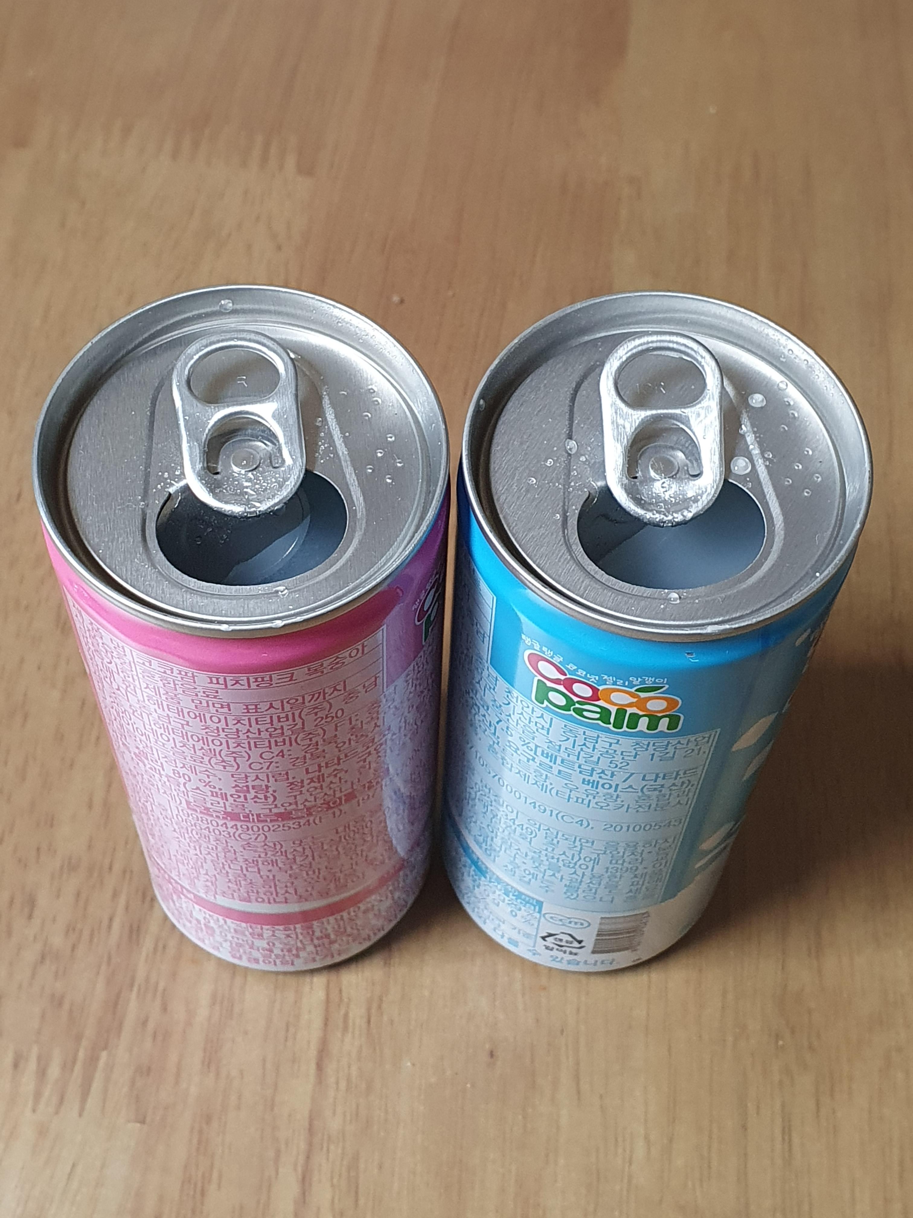 뚜껑을 따서 컵에 따라보았습니다. 캔의 색을 하늘색과 분홍색으로 다른데, 음료의 색은 같습니다.