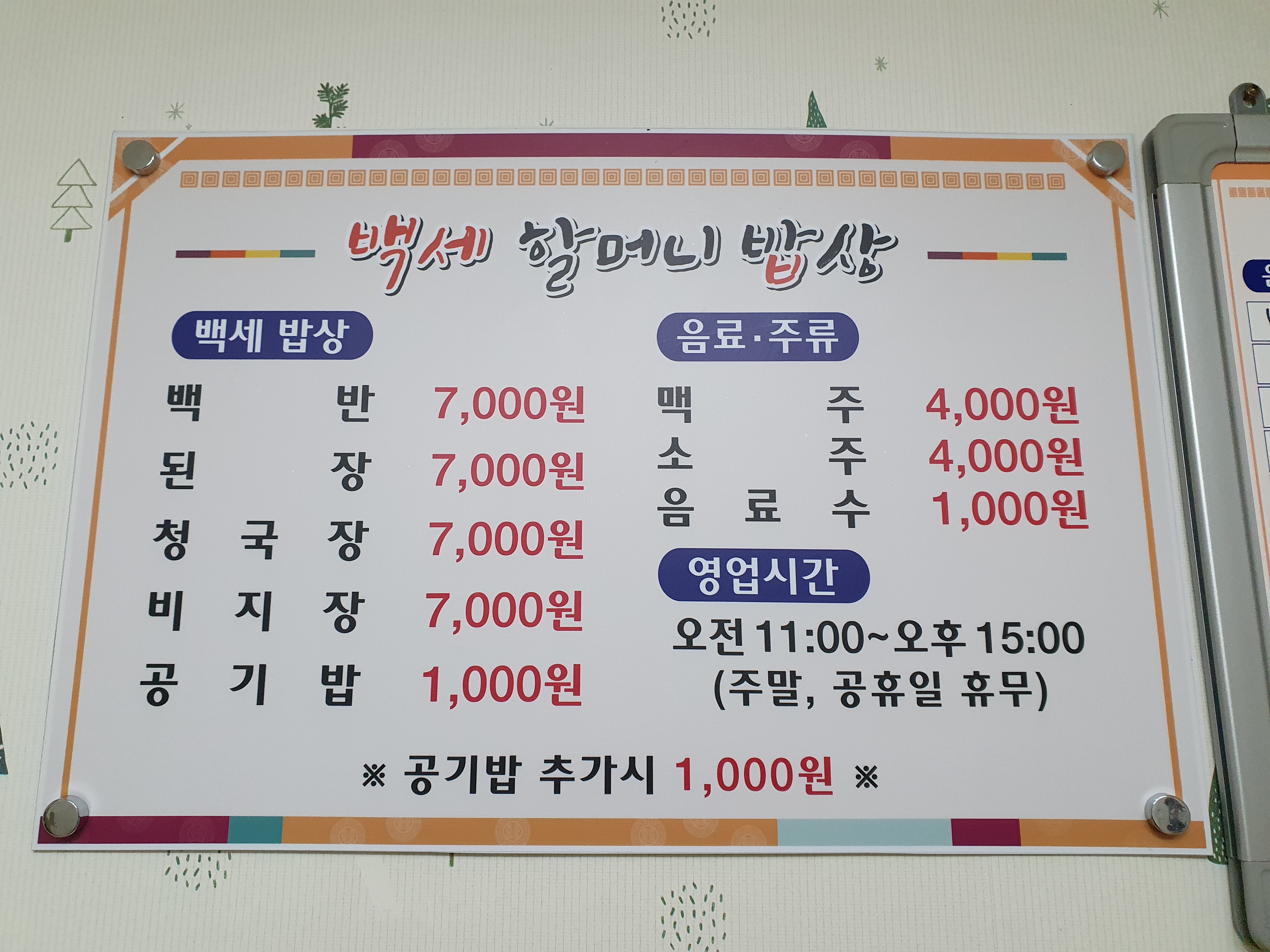 백반, 된장국, 청국장, 비지장이 있습니다. 메뉴는 이게 전부입니다.