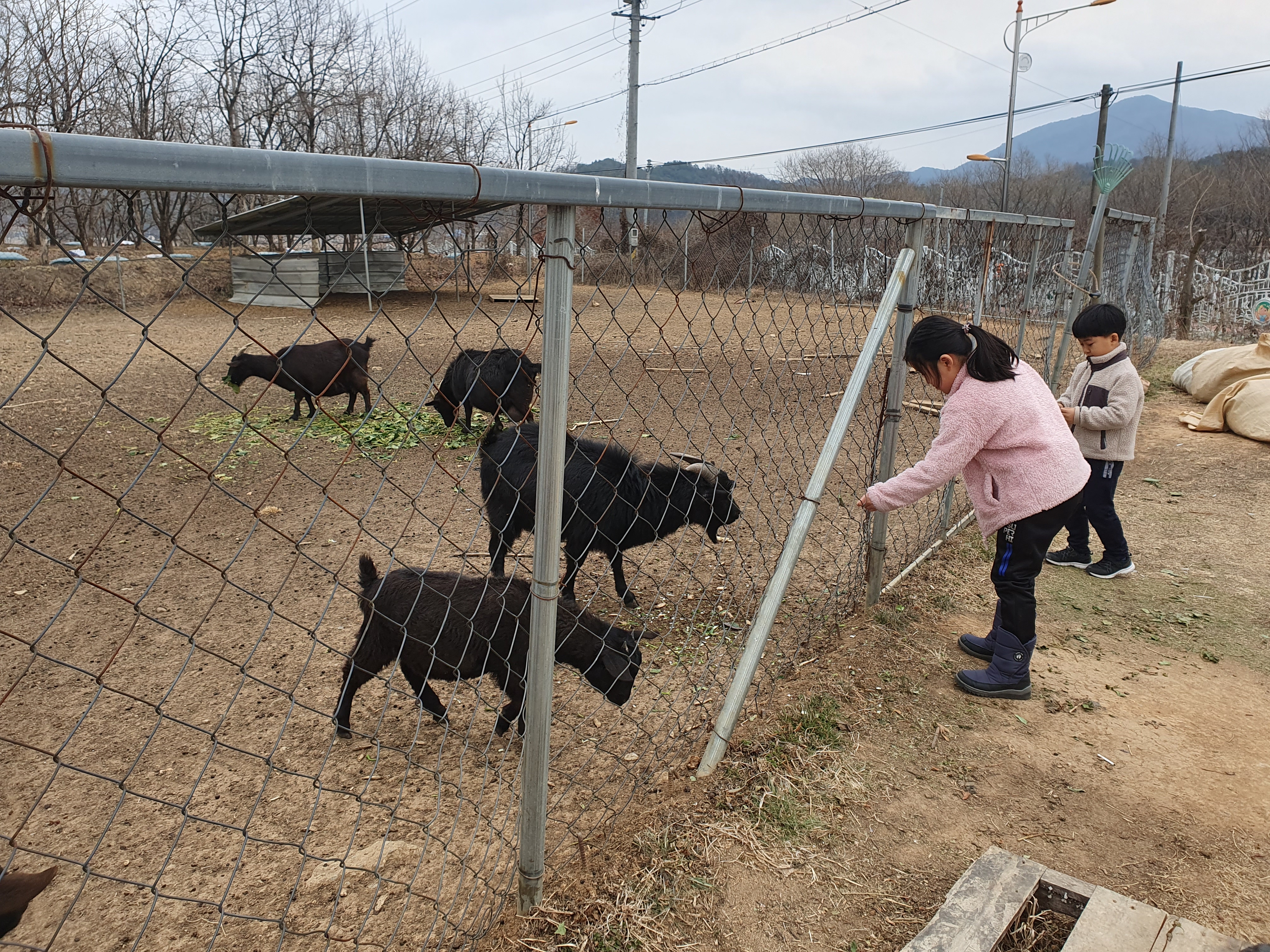 식당 옆에 염소를 키우고 있는데, 아이들이 줄을 서서 염소에게 먹이를 주고 있습니다.