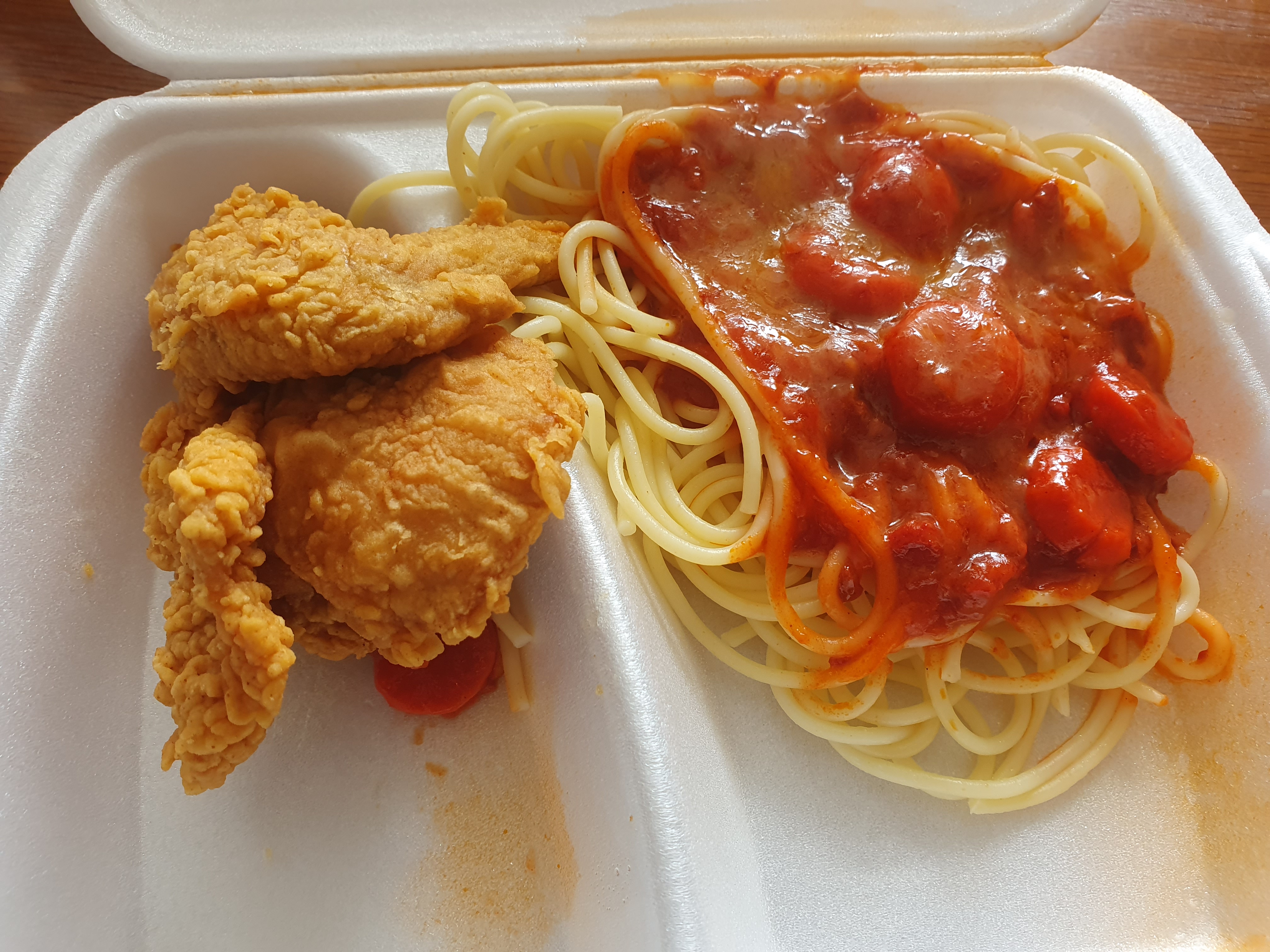 치킨과 스파게티를 시켰는데, 스파게티는 달콤한 맛에 소시지가 들어 있는 스파게티였습니다.
