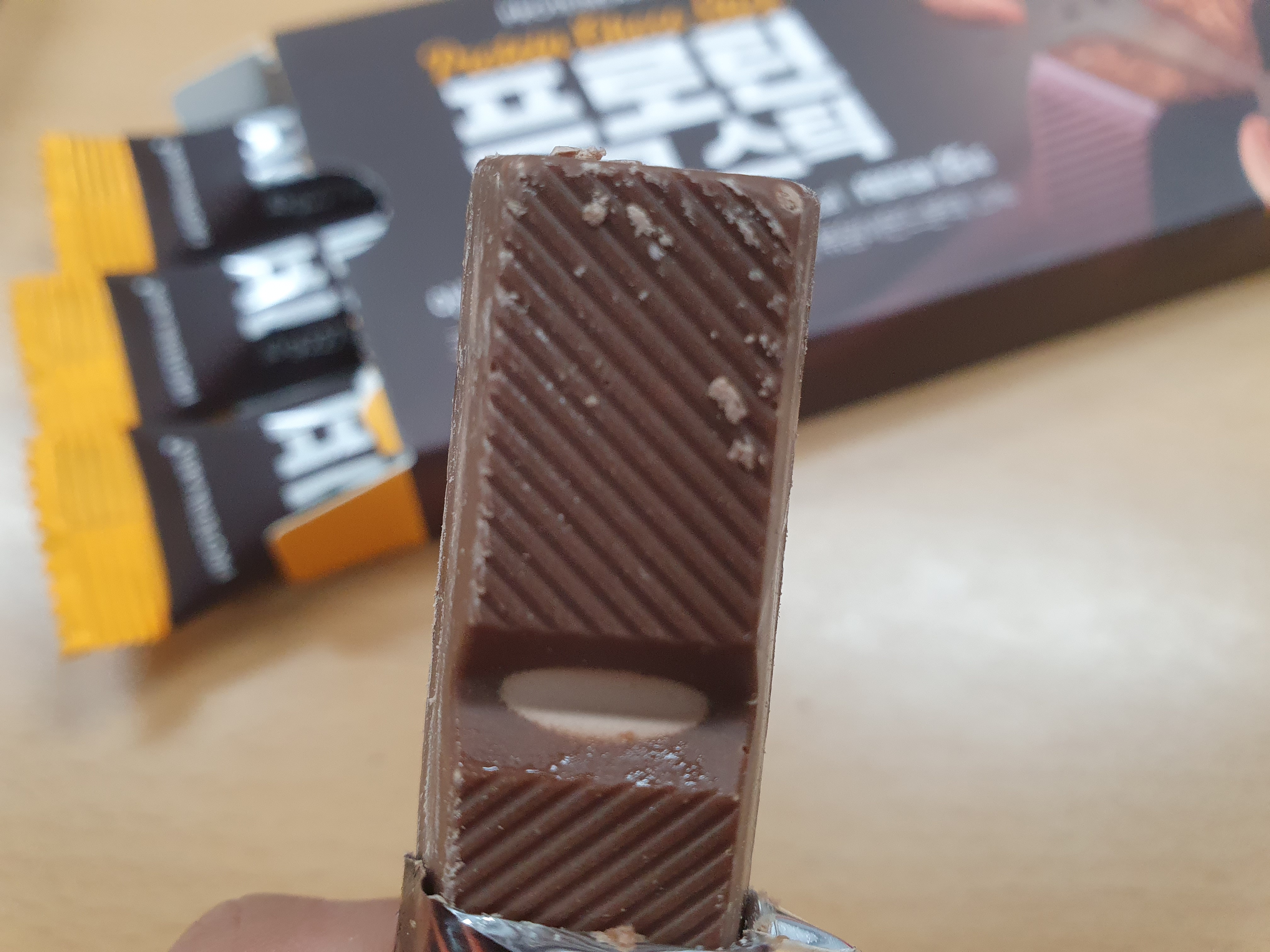하나의 포장지에 길죽하게 프로틴 초코스틱이 들어 있습니다.