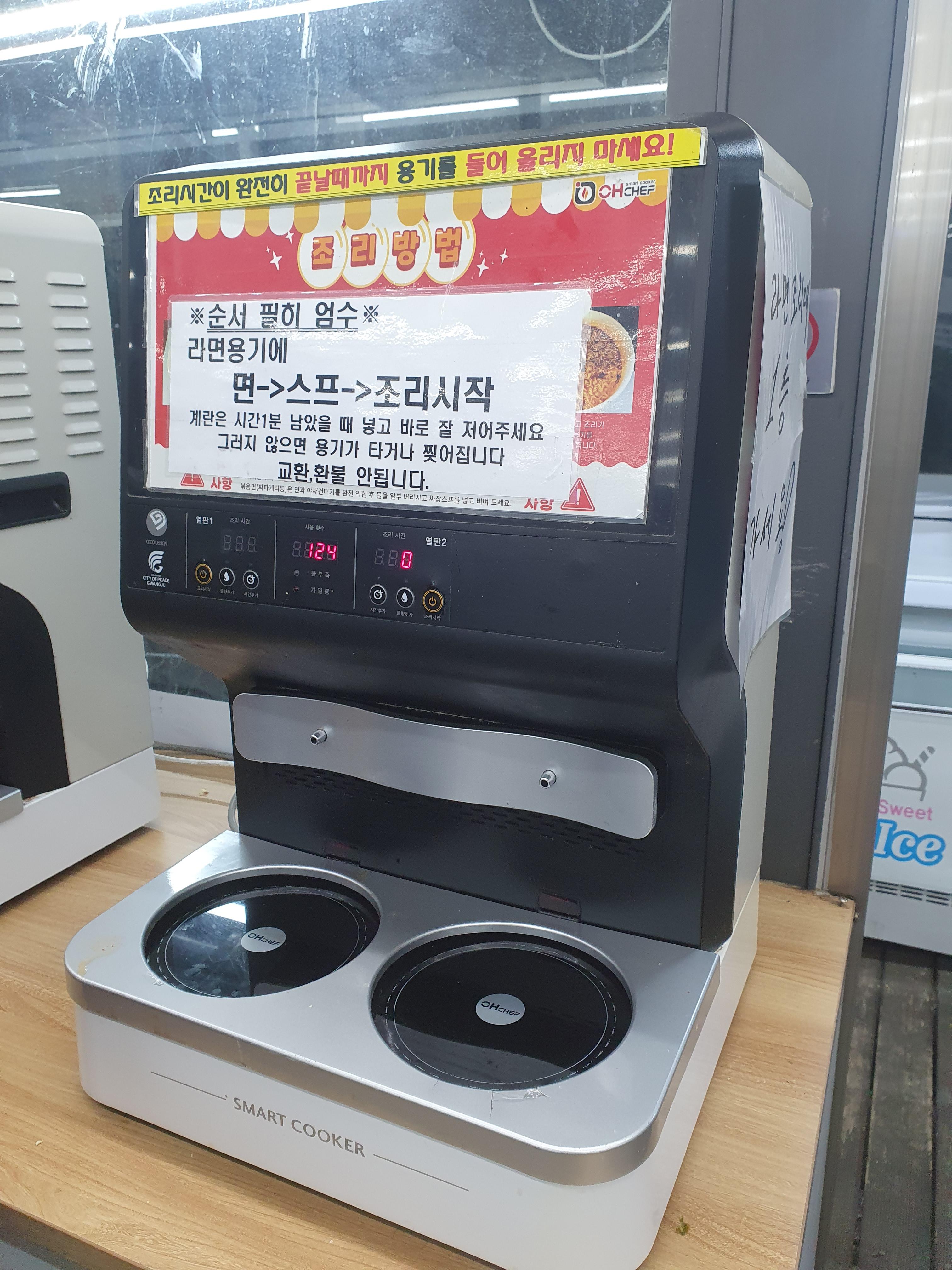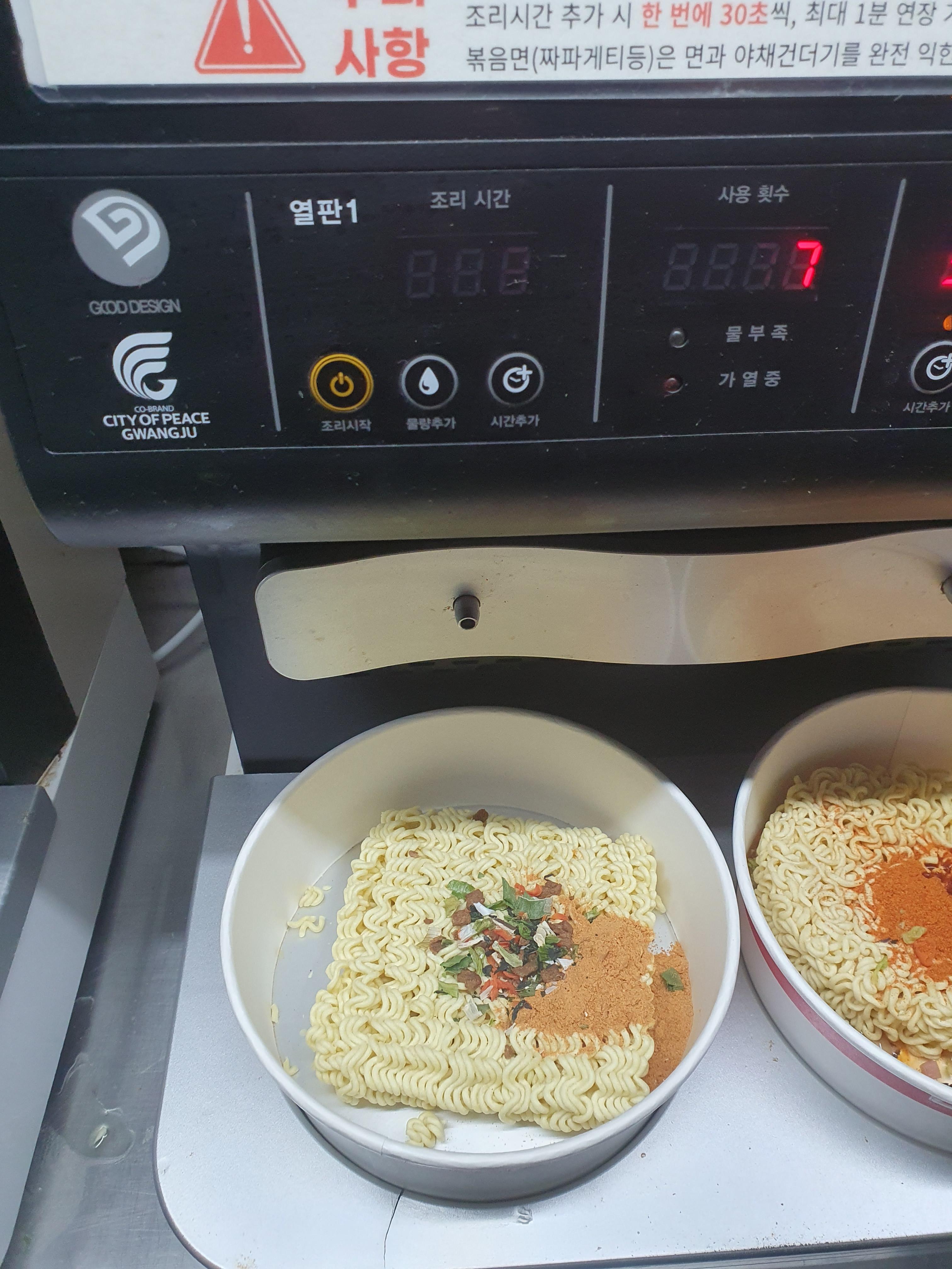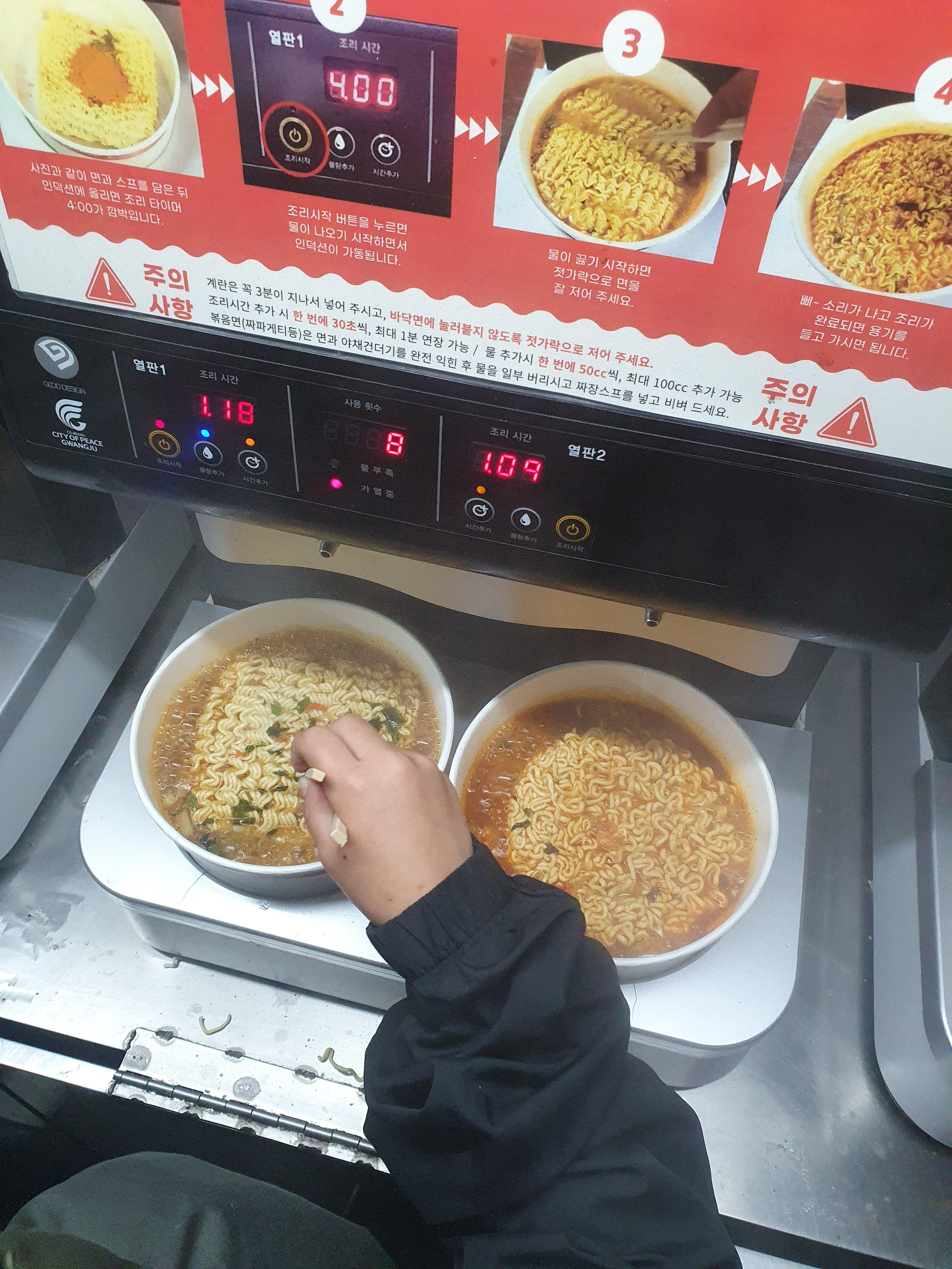 이렇게 용기위에 라면과 스프를 넣어줍니다.