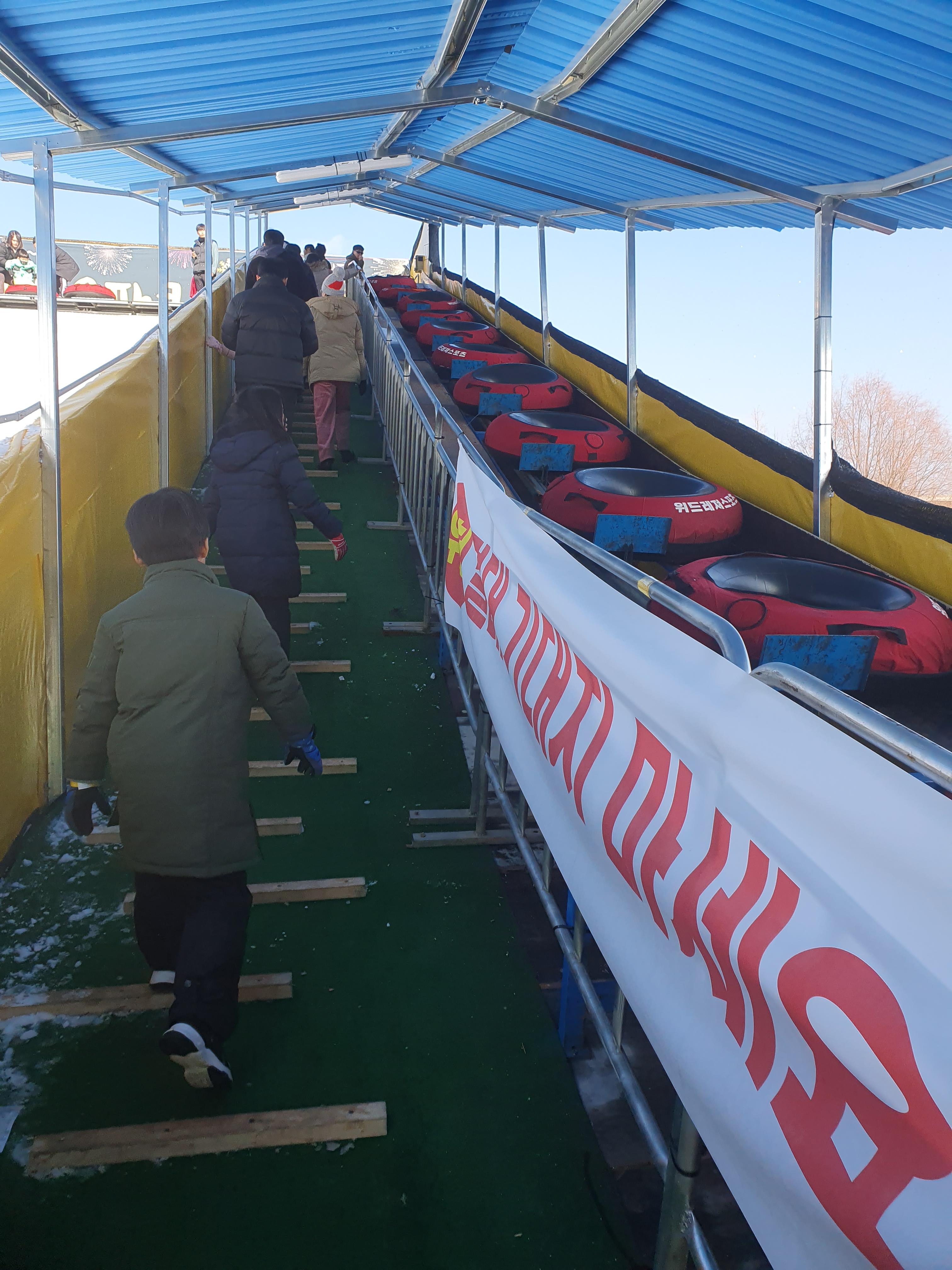 눈썰매를 타기위해서 튜브를 들고서 올라가야합니다.