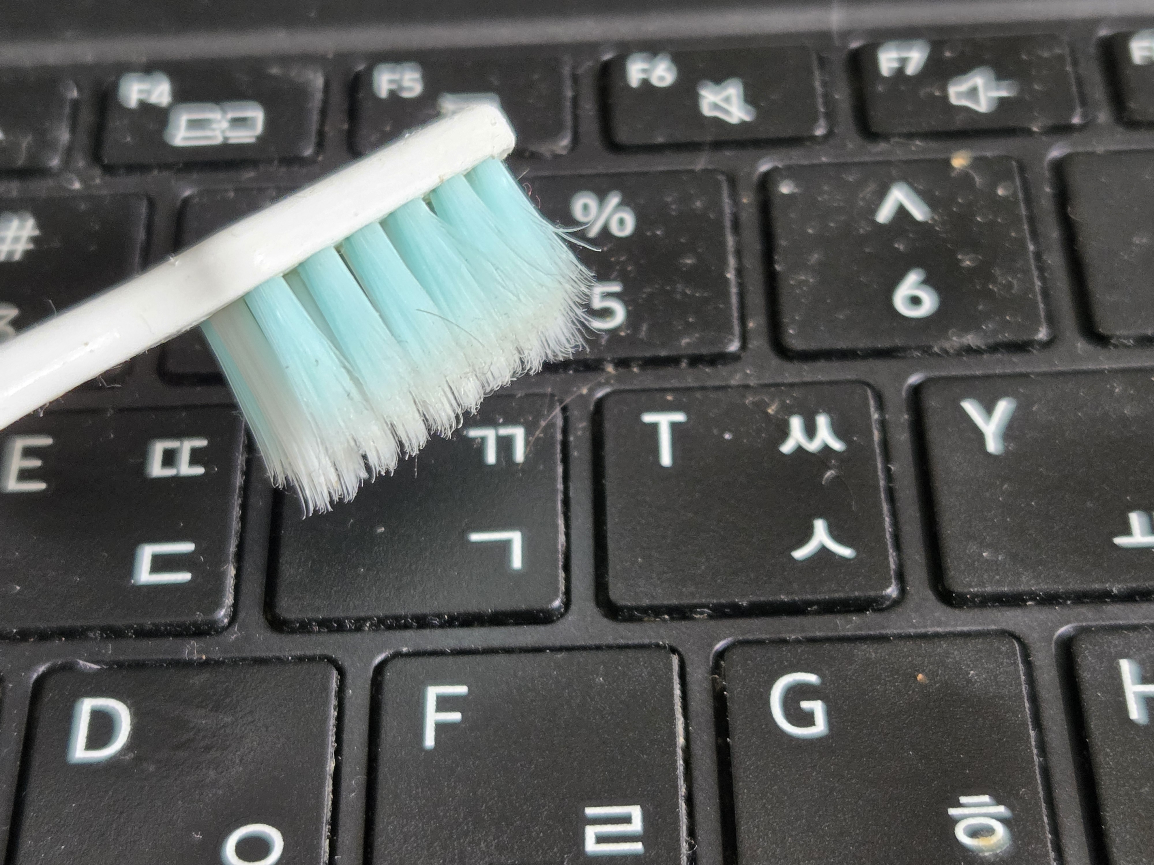 키보드를 다 들어내고서 청소하면 가장 좋겠지만, 혹시 키보드를 고장 낼 수도 있기 때문에, 안쓰는 칫솔을 사용해서 간단하게 청소를 해봅니다. 미세모를 사용해서 사이 사이를 칫솔질하듯이 닦아 주니 먼지들이 쏙쏙 잘 빠집니다.