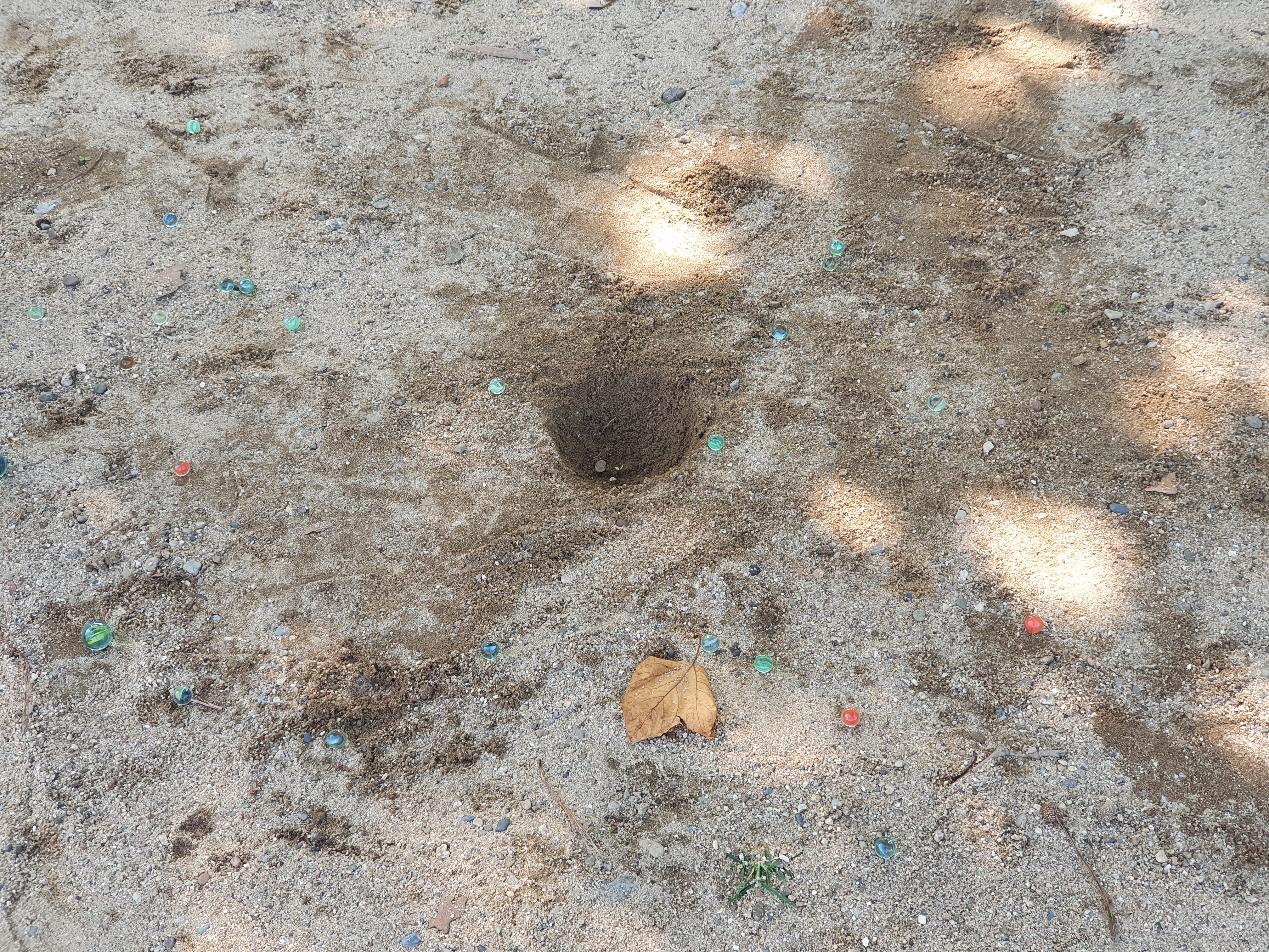야외에서 할 수 있는 구슬치기 두번째 방법은 바닥에 구멍을 만들고 순서대로 구슬을 던져서 구멍에 가장 먼저 넣는 사람이 이기는 게임입니다. 이긴 사람이 이전에 실패했던 모든 구슬을 가져가게 됩니다.